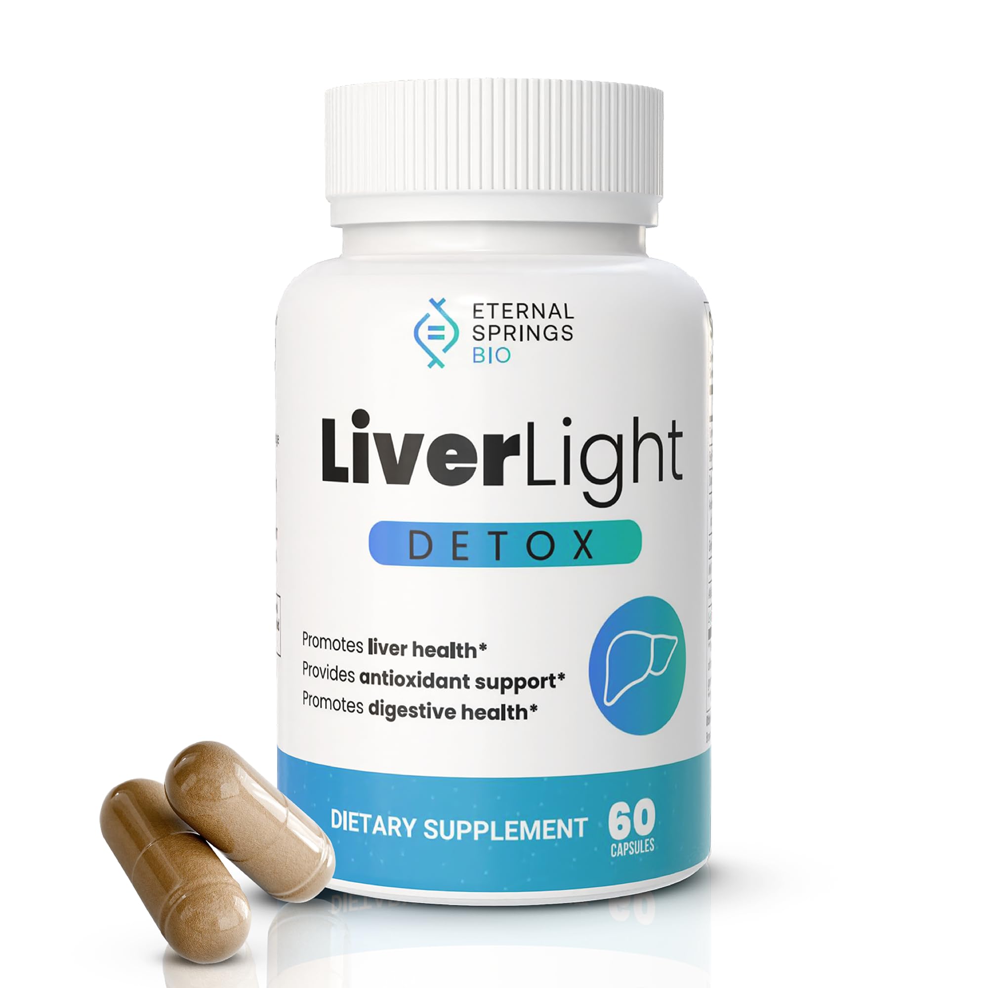 Safety Testing: All Eternal Springs Bio products are tested for heavy metals, microbes, and identify. cGMP Manufactured: LiverLight Detox is manufactured in a current Good Manufacturing Practices facility. Special Dietary Features: Plant-based, gluten-free, dairy-free, soy-free, and nut-free for broader consumer appeal. Dosage Directions: Take 1 capsule daily with a meal and a full glass of water for gentle detoxification. Key Ingredients: Turmeric, Milk Thistle, Artichoke Extract, and Ginger Powder support liver health and antioxidant defense. Formulation: Multi-supplement detox capsule with extended sustained release for optimal effectiveness.