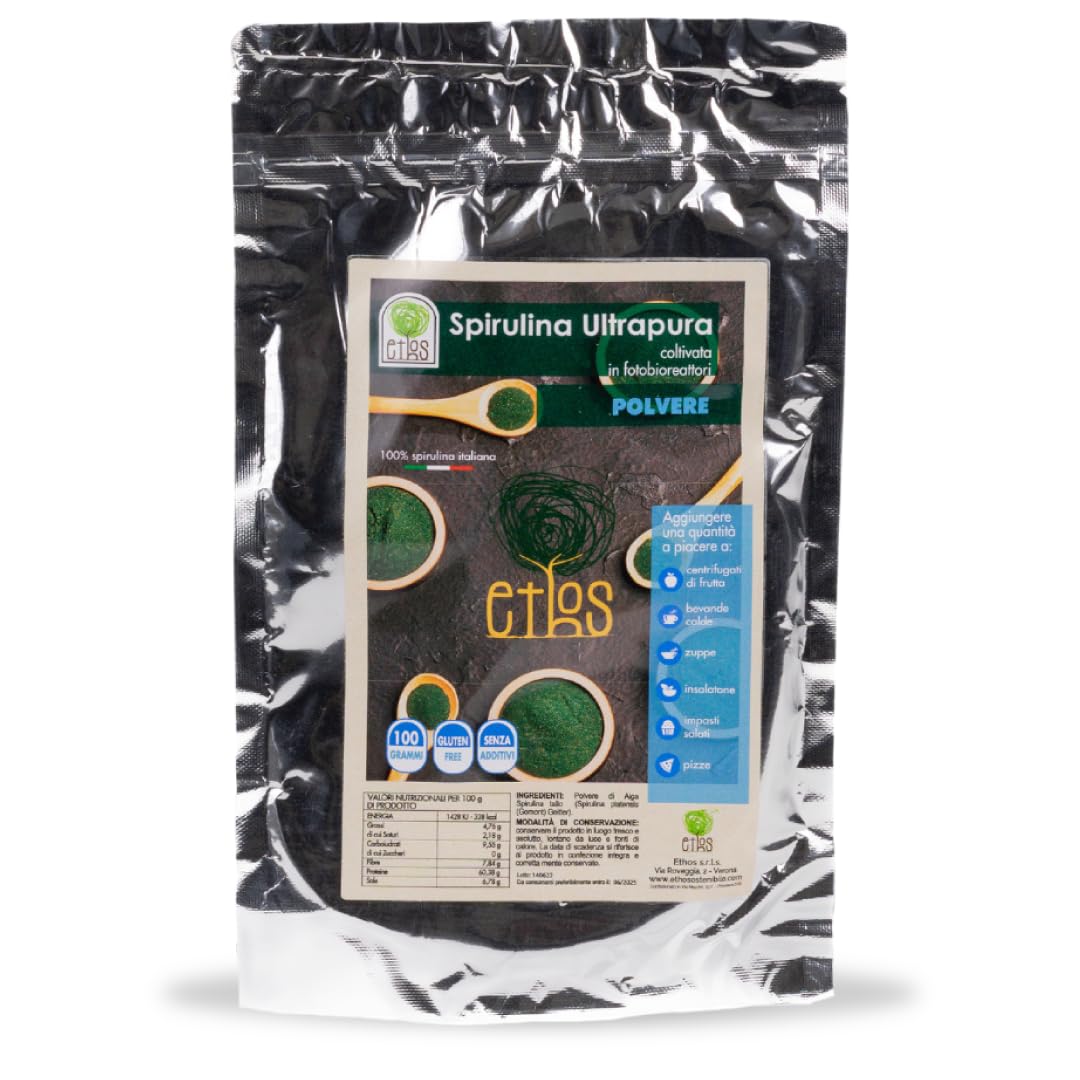 Éthos : travaille pour offrir une alternative nutritionnelle saine et durable. Elle fonctionne avec des pratiques écologiques et une agriculture innovante pour le bien-être de tous et de la planète. Pour tous les goûts : que vous souhaitiez expérimenter en cuisine ou simplement intégrer un boost de nutrition dans votre alimentation, notre spiruline en poudre s'adapte à tous les besoins. Parfait dans les jus, smoothies, tisanes, ou en dissouvant dans l'eau. Riche nutritionnelle : avec une teneur en protéines jusqu'à 70 , la spiruline en poudre éthos soutient la nutrition quotidienne, la récupération musculaire, augmente la concentration et améliore les performances, aussi bien sportives que professionnelles - agit comme antioxydant et anti-inflammatoire, fortifie le système immunitaire et réduit la sensation de fatigue, favorisant le bien-être général. Pur et sûr : fabriqué et emballé en Italie, notre spiruline est cultivée en photobioréacteurs, assurant une protection maximale contre les contaminations extérieures et assurant un produit de haute qualité et sécurité. Polyvalent en cuisine : la spiruline en poudre Ethos est l'ingrédient idéal pour les amateurs de cuisine créative. Avec sa grande polyvalence, du shaker aux pâtes, enrichissez facilement vos plats préférés, tout en conservant un profil nutritionnel riche et équilibré.