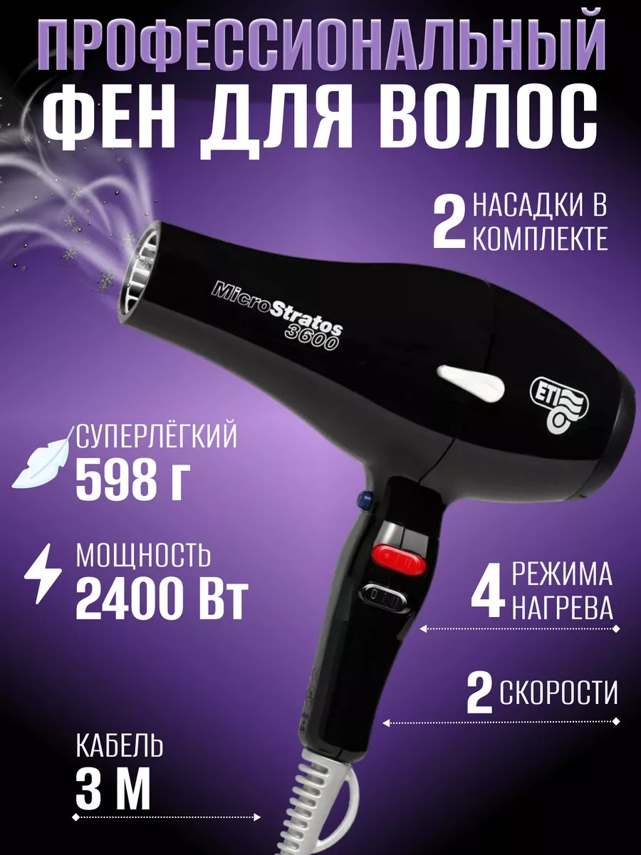Профессиональный фен ETI Micro Stratos 3600 с мощностью 2400Вт, AC мотором и ресурсом 2000 часов. Идеален для парикмахерских, барбер шопов и домашнего ухода.