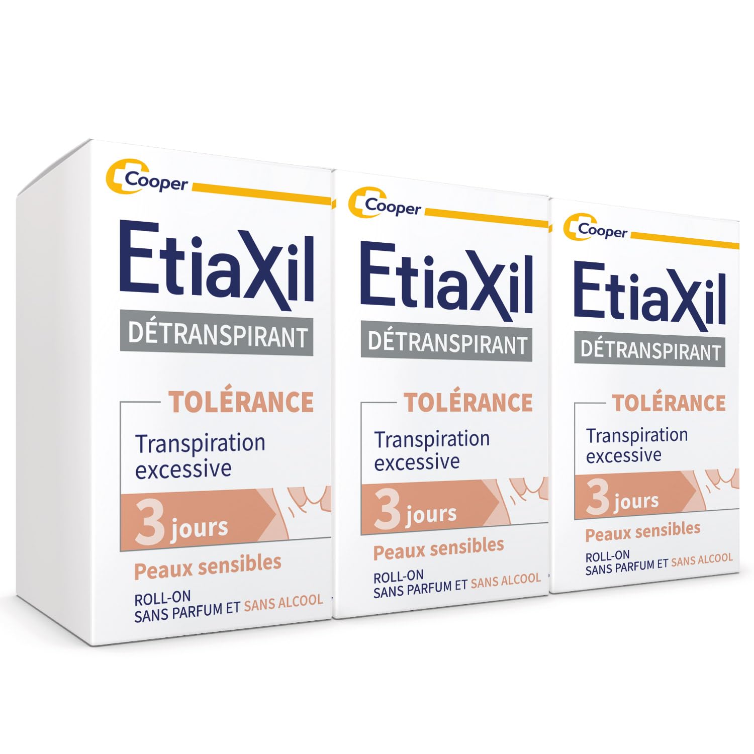 Etiaxil Tolerance Underarm Antiperspirant Treatment is the first level of treatment in the antiperspirant range. Applied every evening at the start of treatment, then 2 to 3 times a week, it provides 3 days of protection against perspiration thanks to its fast and effective action on the sweat glands responsible for sweat production. Say goodbye to dampness and discomfort! Clinically proven efficacy. Stops perspiration for 3 days, ensuring total control. Anti-humidity and anti-odor. Applied to the underarms, the product allows the sweat glands to rest, so they stop producing sweat for a few days. Antiperspirant Efficacy Test, FDA-Guideline for Effectiveness Testing of OTC Antiperspirant Drug Products. Formulated without alcohol and enriched with moisturizing agents to maximize comfort for even the most sensitive skin. This product is fragrance-free and compatible with daily use of deodorant or perfume. • Level 1 treatment for excessive sweating • Proven 3-day effectiveness against perspiration • Respects even the most sensitive skin • Fragrance-free • Formulated without alcohol and enriched with moisturizing agents • Easy-to-apply roll-on applicator. ETIAXIL, the No. 1 anti-perspirant in pharmacies, offers a solution for every type of perspiration: from treatment for excessive sweating to daily deodorant. GERS - Deodorant Market - CAM 09 2023 INGREDIENTS Aqua, Aluminum Chloride, Dipropylheptyl Carbonate, PPG-20 Methyl Glucose Ether, C15-19 Alkane, Glycerin, Polyacrylate Crosspolymer-6, Tocopherol, Sodium Hydroxide DIRECTIONS FOR USE Apply ETIAXIL antiperspirant to your underarms in the evening on clean, healthy, and dry skin until improvement is achieved (usually 2 to 3 days). Allow to air dry, then rinse with soap and water the following morning. Apply every evening and 2 to 3 times a week at the beginning of treatment. SAFETY WARNING The product is odorless and alcohol-free. It is compatible with your usual fragrance products: deodorant, eau de toilette, perfume, etc. • For external use only. • During the first few applications, its effectiveness may cause some irritation in some people. In this case, rinse the underarms with water and use a soothing skin product (cream, lotion, or milk). Wait until the following evening to resume treatment, reducing the amount of product applied. If irritation persists, discontinue treatment and consult a doctor. • Note that Etiaxil may discolor or damage certain fabrics. • Avoid contact with jewelry or other polished metal surfaces. • Do not use this product on children without the advice of a pharmacist or doctor. See moreETIAXIL, the 1 anti-perspirant in pharmacies, offers a solution for every type of perspiration: from treatment for excessive sweating to daily deodorant. GERS - Deodorant Market - CAM 09 2023. DIRECTIONS FOR USE, THE 3S RULE: Apply Etiaxil Antiperspirant TOLERANCE to your underarms in the evening on clean, healthy, and dry skin until improvement is seen (generally 2 to 3 days). Let it dry naturally, then rinse with soap and water the next morning. At the beginning of treatment, apply every evening, then 2 to 3 times a week. Formulated without alcohol and enriched with a moisturizing agent to maximize comfort for even the most sensitive skin. This product is fragrance-free and compatible with the use of a daily deodorant or perfume. CLINICALLY PROVEN EFFICACY: Stops perspiration for 3 days, ensuring total control, moisture and odor. Applied to the underarms, the product allows the sweat glands to rest, preventing them from producing sweat for several days. Antiperspirant Efficacy Test, FDA-Guideline for Effectiveness Testing of OTC Antiperspirant Drug Products. ETIAXIL UNDERARM ANTIPERSPIRANT TOLERANCE: The first level of treatment in the antiperspirant range. It offers 3 days of protection against perspiration thanks to its fast and effective action on the sweat glands responsible for sweat production. Say goodbye to dampness and discomfort!ETIAXIL - Déodorant Détranspirant - Traitement Transpiration Excessive - Aisselles - TOLÉRANCE - Efficacité 3 jours - 3x15 ml Lot de 3DESCRIPTION DU PRODUIT DESCRIPTION DU PRODUIT Traitement anti-transpiration Etiaxil aisselles TOLÉRANCE est le premier niveau de traitement de la gamme détranspirant. Appliqué tous les soirs en début de traitement puis 2 à 3 fois par semaine, il offre une protection pendant 3 jours contre la transpiration grâce à son action rapide et efficace sur les glandes sudoripares responsables de la production de sueur. Dites adieu à l'humidité et à la sensation d'inconfort ! Efficacité cliniquement prouvée Stoppe la transpiration pendant 3 jours et assure ainsi un contrôle total, Anti-Humidité et Anti-Odeur. Appliqué sur les aisselles, le produit permet de mettre au repos les glandes sudoripares, qui cessent alors de produire de la sueur pendant quelques jours. Antiperspirant Efficacy Test, FDA-Guideline for Effectiveness Testing of OTC Antiperspirant Drug Products. Formulé sans alcool et enrichi en agents hydratants pour maximiser le confort des peaux les plus sensibles. Ce produit est sans parfum et compatible avec l'usage d'un déodorant ou d'un parfum au quotidien. • 1er niveau de traitement contre la transpiration excessive • Efficacité prouvée de 3 jours contre la transpiration • Respecte les peaux les plus sensibles • Sans parfum • Formulé sans alcool et enrichi en agents hydratants • Conditionnement roll-on facile à appliquer. ETIAXIL, N 1 CONTRE LA TRANSPIRATION EN PHARMACIE Offre une solution à chaque type de transpiration : du traitement de la Transpiration Excessive au déodorant quotidien. GERS - Marché déodorants - CAM 09 2023 INGRÉDIENTS Aqua, Aluminum Chloride, Dipropylheptyl Carbonate, PPG-20 Methyl Glucose Ether, C15-19 Alkane, Glycerin, Polyacrylate Crosspolymer-6, Tocopherol, Sodium Hydroxide MODE D'EMPLOI Appliquez le détranspirant ETIAXIL sur vos aisselles le soir sur une peau propre, saine