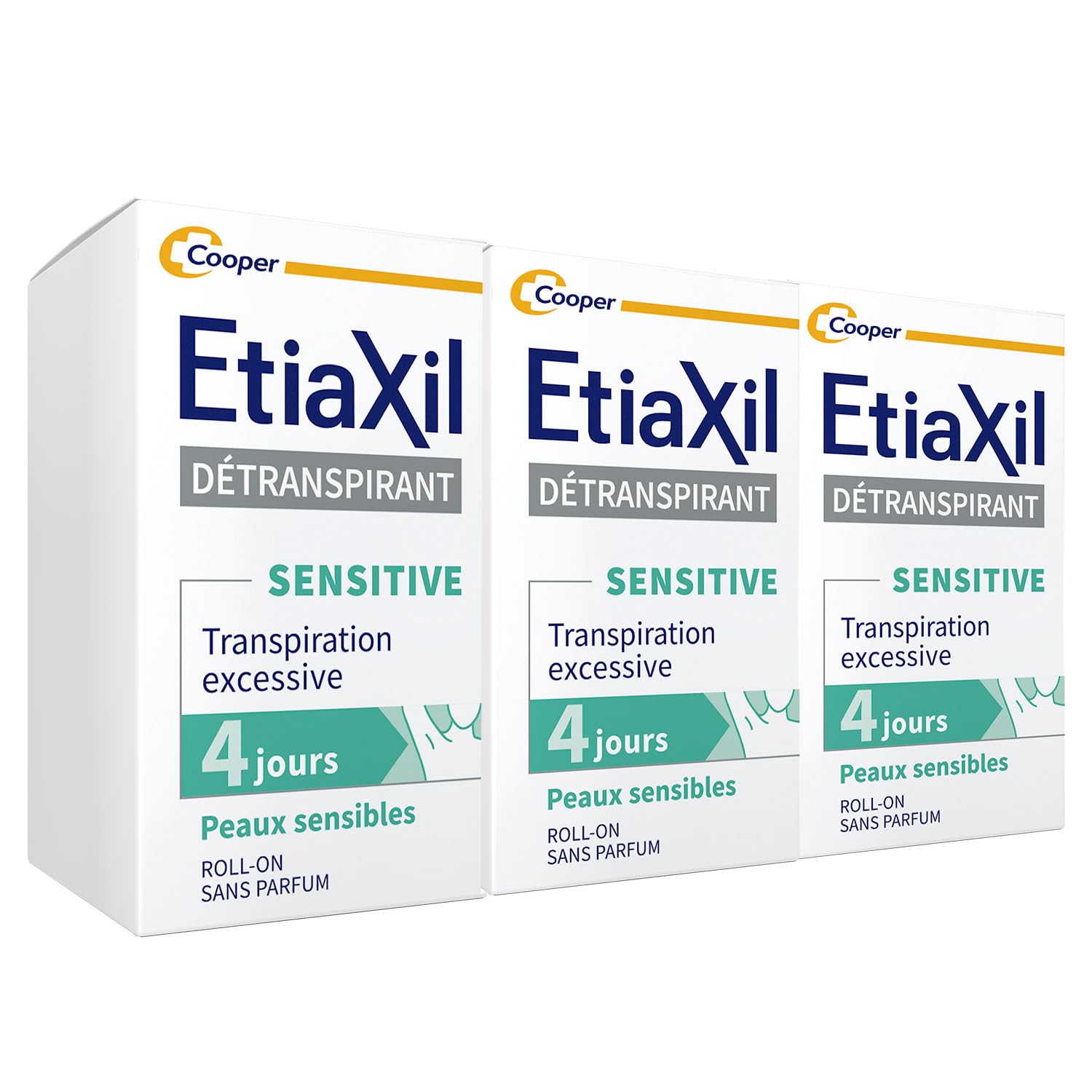 1 antiperspirant treatment in pharmacies. Etiaxil Underarms for Sensitive Skin is the best-selling treatment for excessive perspiration in pharmacies. Applied every evening at the start of treatment, then 2 to 3 times a week, it offers 3 to 5 days of protection against perspiration thanks to its fast and effective action on the sweat glands responsible for sweat production. Say goodbye to dampness and discomfort! High skin tolerance: Formulated with the patented CPX complex, which maximizes comfort for even the most sensitive skin, Etiaxil Underarm Antiperspirant helps you regain natural comfort. Your skin is soft and dry all day long. Compatible with the use of deodorant or perfume: Fragrance-free, Etiaxil Sensitive Skin 15ml can be used in combination with a deodorant or perfume. Proven effectiveness against perspiration for 3 to 5 days. Respects sensitive skin Fragrance-free Easy-to-apply roll-on applicator. In case of adverse effects, you can write to vigilanceFR cooperconsumerhealth.com. RIEMANN A S. DK-3400 Hilleroed. INGREDIENTS Alcohol Denat., Aluminum Chloride, Calcium Lactate, Hydroxypropylcellulose, Hydrogenated Castor Oil. DIRECTIONS Apply under your armpits every night to clean, healthy, and dry skin until improvement is seen (usually 2 to 3 days). Allow to dry naturally, then rinse with soap and water the following morning. At the beginning of treatment, apply every night, then 2-3 times per week. SAFETY WARNING Fragrance-free: Suitable for everyone, Etiaxil antiperspirant for normal skin does not contain perfume. It is therefore fully compatible with your usual perfume or deodorant. Proven effective for 5 days against excessive perspiration. Suitable for normal skin. Fragrance-free. Roll-on applicator for easy and pleasant use. In case of adverse effects, please write to vigilance cooper.fr. See moreETIAXIL, the 1 anti-perspirant in pharmacies, offers a solution for every type of perspiration: from treatment for excessive sweating to daily deodorant. GERS - Deodorant Market - CAM 02 2022. DIRECTIONS FOR USE, THE 3S RULE: Apply Etiaxil Antiperspirant for Sensitive Skin under your armpits every evening to clean, healthy, and dry skin until improvement is seen (usually 2 to 3 days). Let it dry naturally, then rinse with soap and water the next morning. At the beginning of treatment, apply every evening, then 2 to 3 times a week. PATENTED FORMULA: High skin tolerance. Formulated with the patented CPX complex, which maximizes comfort for even the most sensitive skin, Etiaxil Underarm Antiperspirant helps you regain natural comfort. Fragrance-free, this product is compatible with daily use of deodorant or perfume. CLINICALLY PROVEN EFFECTIVENESS: Stops perspiration for 3 to 5 days, ensuring total control, moisture and odor. Applied to the underarms, the product allows the sweat glands to rest, preventing them from producing sweat for several days. Antiperspirant Efficacy Test, FDA-Guideline for Effectiveness Testing of OTC Antiperspirant Drug Products. ETIAXIL UNDERARM ANTIPERSPIRANT FOR SENSITIVE SKIN: The best-selling treatment for excessive perspiration in pharmacies. It offers 3 to 5 days of protection against perspiration thanks to its fast and effective action on the sweat glands responsible for sweat production. Say goodbye to dampness and discomfort!ETIAXIL - Déodorant Détranspirant - Traitement Transpiration Excessive - Aisselles - Peaux Sensibles - Roll-on - Efficacité 4 jours -15 ml - Lot de 3DESCRIPTION DU PRODUIT DESCRIPTION DU PRODUIT Traitement anti-transpiration n 1 en pharmacie.Etiaxil aisselles Peaux sensibles est le traitement contre la transpiration excessive le plus vendu en pharmacie. Appliqué tous les soirs en début de traitement puis 2 à 3 fois par semaine, il offre une protection de 3 à 5 jours contre la transpiration grâce à son action rapide et efficace sur les glandes sudoripares responsables de la production de sueur. Dites adieu à l'humidité et à la sensation d'inconfort ! Haute tolérance cutanée : Formulé avec le complexe breveté CPX, qui maximalise le confort des peaux les plus sensibles, le détranspirant aisselles Etiaxil pour vous aider à retrouver un confort naturel. Votre peau est douce et sèche tout au long de la journée.Compatible avec l'usage d'un déodorant ou d'un parfum :Sans parfum, Etiaxil Peaux sensibles 15 ml peut s'utiliser en association avec un déodorant ou un parfum. Efficacité prouvée de 3 à 5 jours contre la transpiration Respecte les peaux sensibles Sans parfum Conditionnement roll-on facile à appliquer. En cas d'effets indésirables, vous pouvez écrire à vigilanceFR cooperconsumerhealth.com. RIEMANN A S. DK-3400 Hilleroed. INGRÉDIENTS Alcohol Denat., Aluminum Chloride, Calcium Lactate, Hydroxypropylcellulose, Hydrogenated Castor Oil. MODE D'EMPLOI Appliquer sous vos aisselles tous les soirs sur une peau propre, saine et sèche jusqu'à amélioration (généralement 2 à 3 jours). Laisser sécher naturellement, puis rincer à l'eau et au savon le lendemain matin. Au début du traitement, appliquez tous les soirs puis 2-3 fois par semaine. AVERTISSEMENT DE SÉCURITÉ .Sans parfum :Adapté à tous, le détranspirant Etiaxil peaux normales ne contient pas de parfum. Il est de ce fait totalement compatible avec l'utilisation de votre parfum ou de votre déodorant habituel.Efficacité prouvée pendant 5 jours contre la transpiration excessive.Adapté pour les peaux normales.Sans parfum.Conditionnement roll-on pour une utilisation facile et agréable. En cas d'effets indésirables, vous pouvez écrire à vigilance cooper.fr. Voir plusETIAXIL, N 1 CONTRE LA TRANSPIRATION EN PHARMACIE, offre une solution à chaque type de transpiration : du traitement de la Transpiration Excessive au déodorant quotidien. GERS - Marché déodorants - CAM 02 2022. CONSEILS D'UTILISATION, LA REGLE DES 3S : Appliquez Etiaxil Détranspirant Peaux sensibles sous vos aisselles tous les Soirs sur une peau propre, Saine et Sèche j