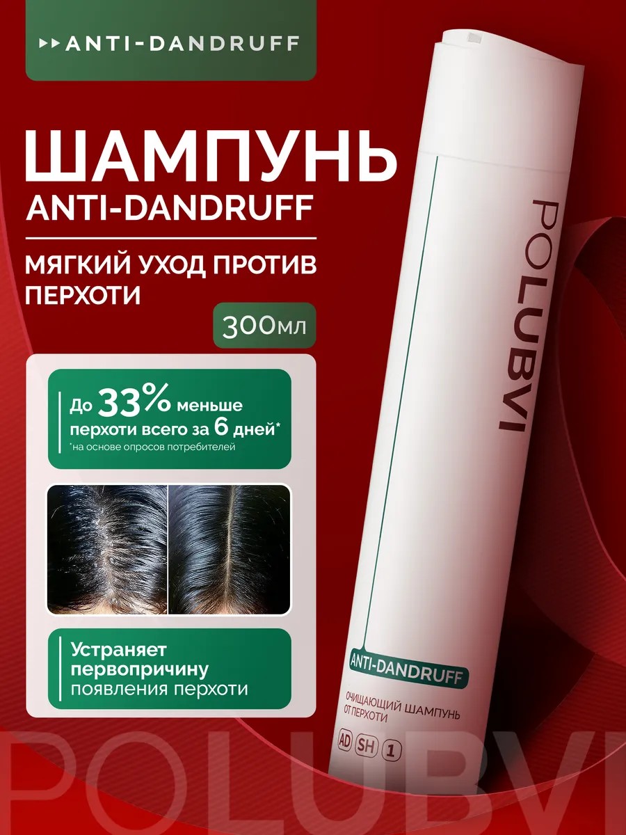 Anti-Dandruff от POLUBVI — эффективный шампунь-лечебник для борьбы с перхотью и хроническим зудом кожи головы. Фитокомплекс эфирных масел лаванды, лавра, тимьяна и розмарина успокаивает раздражённую кожу, борется с грибком Malassezia, нормализует работу сальных желез. Экстракт амазонского дерева восстанавливает микробиоту, а салициловая кислота обеспечивает мягкое, но глубокое эксфолиирование. Уже через 6 дней применения перхоть уменьшается на 33 %, жирность — на 30 %, зуд и дискомфорт исчезают после первого мытья. Шампунь без SLS, без парабенов, с травяным ароматом, подходит для чувствительной и аллергичной кожи головы.
