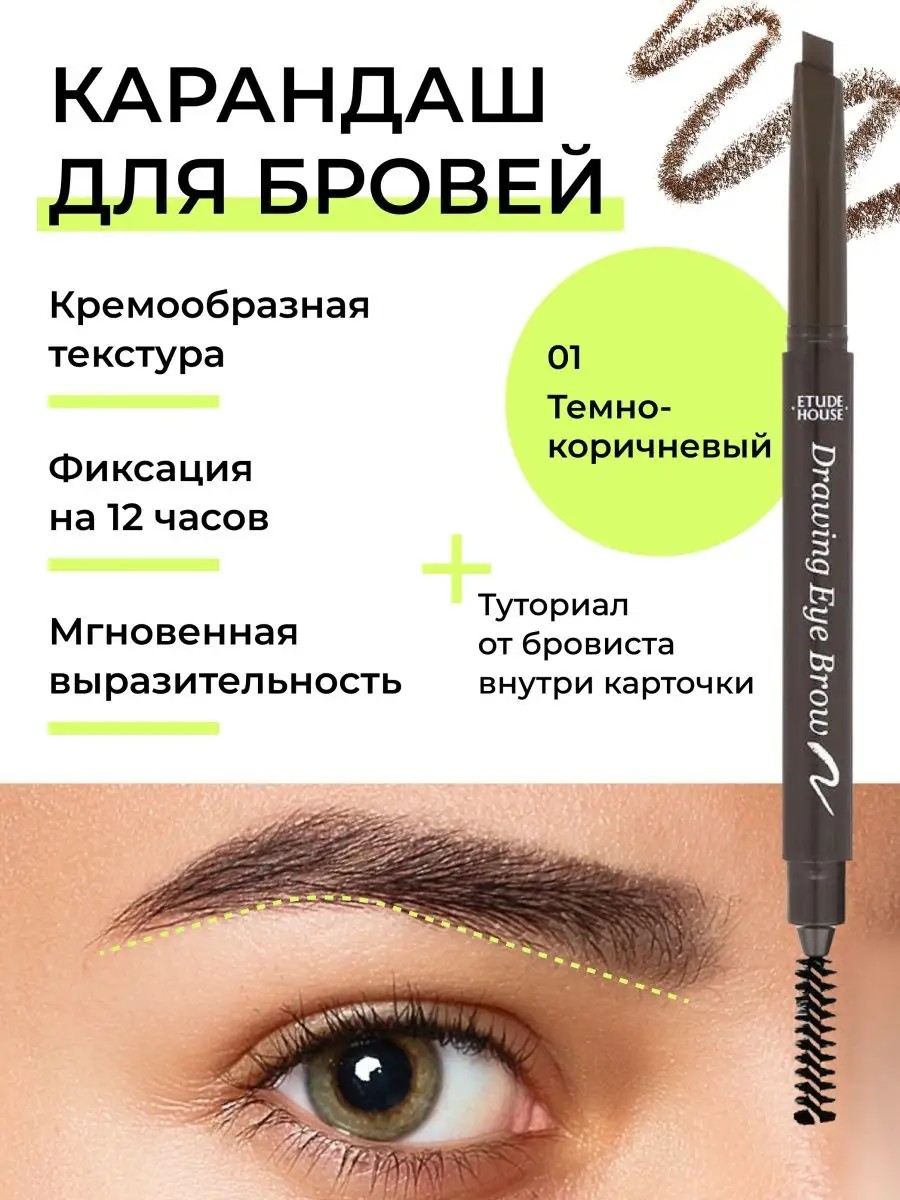 The Etude House Drawing Eye Brow eyebrow pencil is a tool for defining eyebrows. It instantly adds definition, thickness, and a well-groomed look. One end of the product features a triangular tip, while the other has a special brush for beautiful blending. The pencil's hard, flat, and beveled tip allows you to create lines that mimic natural hairs. It has a wide, thin surface. It's automatic and requires no sharpening. Shades: #1 Dark Brown, #2 Gray, #4 Dark Gray, #7 Light Brown, Light. Ideal for eye makeup. This long-lasting and waterproof gel pencil is very easy to use. This dark brown liner preserves the natural look of your brows. Decorative Korean cosmetics from Korea are a must-have for any modern woman. It's a perfect gift for your wife, friend, colleague, or girlfriend for any occasion—be it a birthday, March 8th, Valentine's Day, or any occasion.