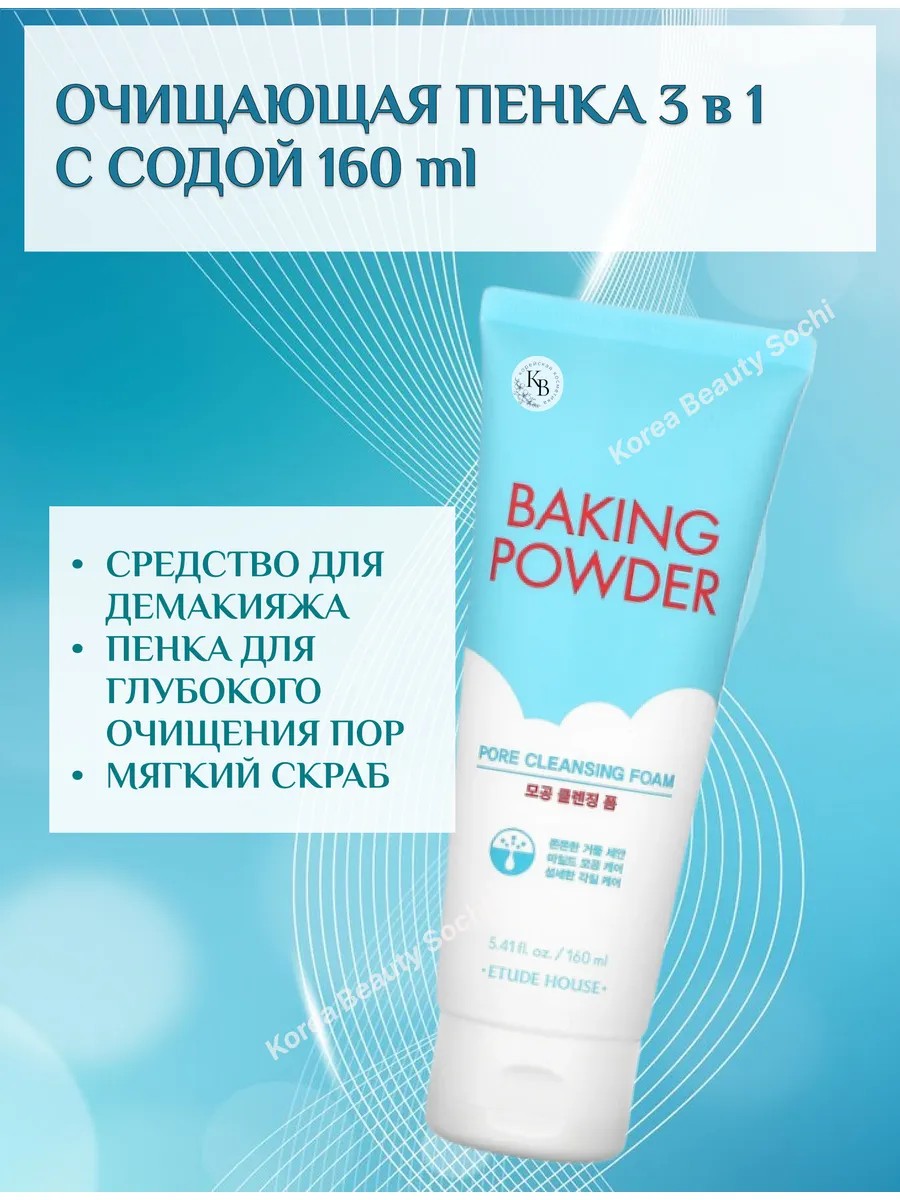The Etude House Baking Powder Pore Cleansing Foam 3-in-1 cleansing foam with baking soda combines the functionality of three products: a makeup remover, a gentle exfoliant, and a deep pore cleansing foam. Thanks to cellulose microgranules, the foam penetrates pores and draws out all impurities; thanks to lactic acid, it exfoliates and removes dead skin cells; thanks to baking soda, it disinfects, prevents clogged pores and inflammation, and soothes the skin. This universal foam is suitable for all skin types, including problematic and sensitive skin. Directions for use: Wash your face with warm water to moisturize. Squeeze a pea-sized amount of the product into your palm and rub it with wet hands, creating a lather. Spread the resulting foam over your entire face, gently massaging to dissolve makeup and remove impurities. Rinse thoroughly with warm water.