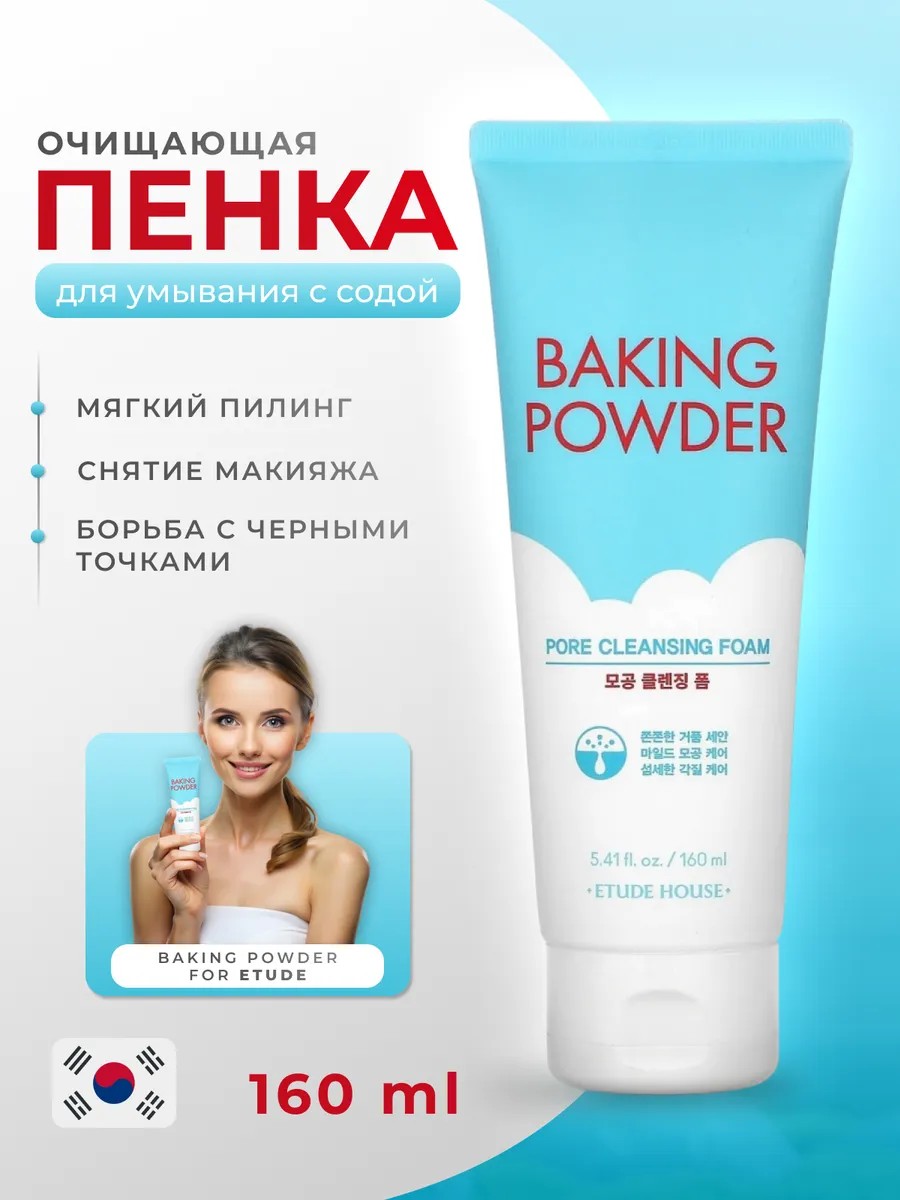 Очищающая пенка 3 в 1 с содой Etude house baking powder pore cleansing foam объединяет в себе функциональность сразу трёх продуктов: средства для удаления макияжа, мягкого пилинга и пенки для глубокого очищения пор. Благодаря микрогранулам целлюлозы пенка для умывания способна проникнуть в поры и вытолкнуть оттуда все загрязнения, благодаря молочной кислоте — отшелушить и удалить ороговевшие клетки эпидермиса, благодаря соде — обеззаразить, предупредить закупорку пор и появление воспалений, успокоить кожу.