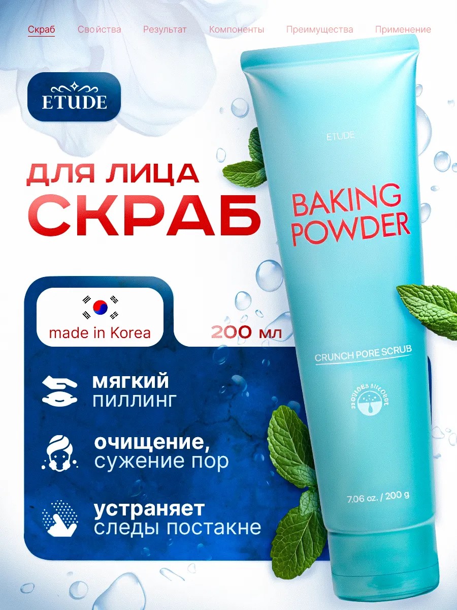 Скраб для лица с содой Etude House Baking Powder Crunch Pore Scrub на 43,5% состоит из мельчайших крупинок соды и за счет этого эффективно очищает поры от загрязнений.Корейский скраб представлен в разных комплектациях и объеме. Скраб мягко отшелушивает омертвевшие частички кожи, стимулируя клеточное обновление, обеззараживает и оздоравливает тон лица. Содовый скраб обладает приятным охлаждающим эффектом. Глубоко очищает поры от всех видов загрязнений, абсорбирует излишки кожного сала, оказывает отшелушивающее действие и полирует поверхность эпидермиса..