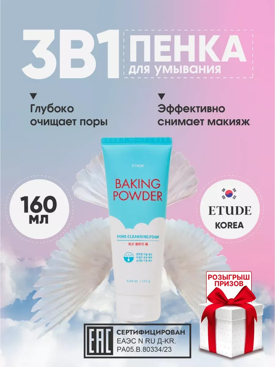 Корейская пенка для умывания Etude House Baking Powder - это интенсивно очищающая пенка, которая с помощью соды отшелушивает кожу во время умывания, помогая избавиться от макияжа, жира и грязи без раздражения кожи. Пенка имеет уникальный состав, в который входит сода: именно из-за нее продукт имеет название Baking Powder и стал настоящим хитом на рынке. Содовая умывашка для лица позволит вам тратить меньше времени на рутинную ежедневную работу по уходу за кожей и больше времени на то, что важно для вас. При этом ваша кожа останется свежей и красивой благодаря интенсивному действию пенки. Ухаживающая пенка для снятия макияжа изготовлена из полностью безопасных ингредиентов. В составе: миристиновая и лауриновая кислоты, бикарбонат натрия, глицерилкоат, глицерин и вода. Миристиновая кислота способствует восстановлению защитных свойств кожи, оказывает легкое антивозрастное действие и усиливает эффект других полезных веществ пенки. Лауриновая кислота снижает активность болезнетворных микроорганизмов, подсушивает и тем самым уменьшает воспаления (угри, прыщи, и другие), способствует сужению пор. Бикарбонат натрия производит отшелушивание ороговевших частиц кожи, обновляет и омолаживает ее, что сопоставимо с пилингом в салоне. Глицерилкоат мягко очищает кожу от пыли, грязи, пота и кожного сала, убирает жирный блеск, выравнивает тон кожи. Это полностью безопасный для человека и окружающей среды компонент, который используют даже в детском мыле и шампунях. Корейская матирующая пенка для лица - это идеальный способ смыть все следы макияжа и загрязнений с лица, глаз и губ. Органическая комбинированная формула достаточно нежна для чувствительной кожи, но при этом достаточно эффективна, чтобы очистить и освежить кожу. Пенка делает кожу мягкой и гладкой, а натуральные ингредиенты глубоко очищают и сужают поры, помогают удалить отмершие клетки кожи. Пена для лица подходит всем обладателям кожи с повышенной выработкой себума: это средство от прыщей для подростков и для взрослых.