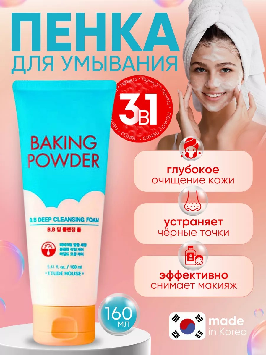 Пенка для умывания лица с содой Baking Powder BB Deep Cleansing Foam от корейского бренда Etude House - это ежедневное средство для подростков и взрослых, борющихся с прыщами и акне, жирной кожей, сухостью и другими несовершенствами кожи любого типа кожи.