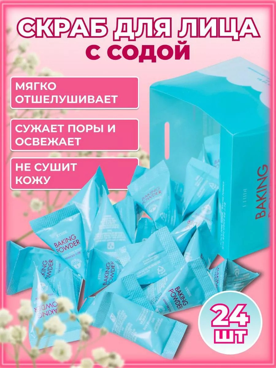 Корейская косметика - скраб для лица с содой Etude Baking Powder Crunch Pore Scrub. Корейский скраб для лица и тела на 40 процентов состоит из мелких крупинок соды, которые быстро и качественно очищают поры от загрязнений, отшелушивают омертвевшие частички кожи, стимулируют клеточное обновление, оздоравливают, делают равномерным тон лица. Etude House бейкинг павдер обеспечивает приятный охлаждающий эффект. Скраб в пирамидках - замечательный подарок маме, подруге, коллеге или сестре на любой повод. Эффект будет заметен уже после первого применения! А так как набор состоит из 24 пирамидок по 7 грамм вам надолго хватит такого ухода. Отличный подарок и наполнение для подарочного бьюти бокса.