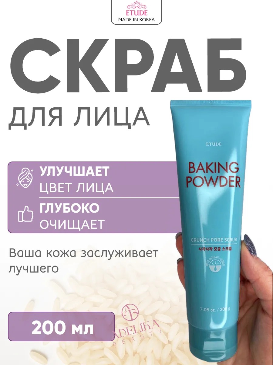 Скраб для лица с содой Etude House Baking Powder Crunch Pore Scrub на 43,5% состоит из мельчайших крупинок соды и за счет этого эффективно очищает поры от загрязнений.Корейский скраб представлен в разных комплектациях и объеме. Скраб мягко отшелушивает омертвевшие частички кожи, стимулируя клеточное обновление, обеззараживает и оздоравливает тон лица. Содовый скраб обладает приятным охлаждающим эффектом.Скраб для лица Корея мягко, но глубоко очищает поры от всех видов загрязнений, абсорбирует излишки кожного сала, оказывает отшелушивающее действие и полирует поверхность эпидермиса.Скраб для лица Etude House подходит для лица, для губ, для тела, для рук. Так же скраб для лица мужской, идеально подходит, как для женщин, так и для мужчин.Скраб в пирамидках оказывает лёгкий охлаждающий эффект, сужает поры и освежает.Основные действующие компоненты:Бикорбонат натрия (пищевая сода) - мощный антисептик, помогает смягчить и интенсивно очистить кожу. Активно используется в пилингах и скрабах благодаря выраженной отшелушивающей способности, снимает раздражение. Наличие нейтрального pH и химических свойств обеспечивают универсальность использования - сода подходит для кожи любого типа.Микроскристаллическая целлюлоза - натуральный компонент, который способствует глубокому, но при этом деликатному очищению пор от загрязнений и ороговевших частиц, а также абсорбирует излишки кожного жира, придавая коже чистоту и матовость. Скраб с содой подходит для всех типов кожи, нормальной, жирной, комбинированной и проблемной кожи. Скраб от черных точек на лице отлично подходит мужчинам и женщинам, парням и девушкам, подросткам и детям. Мелкие частички соды не вызовут неприятных ощущений. Очищающий скраб пилинг для лица при использовании, рекомендуется избегать область вокруг глаз и губ, чтобы не вызвать раздражений.Скраб для умывания не только наносит пользу, но и обеспечивает приятный охлаждающий эффект.