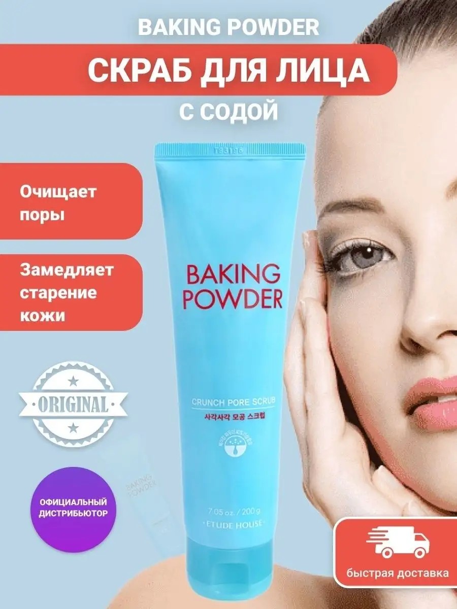Скраб для лица с содой Etude House Baking Powder Crunch Pore Scrub один из главных бестселлеров корейской косметики, который покорил сердца миллионов девушек. Косметика для каждой девушки, девочки, женщины имеет важное значение, как и уход за кожей, который придает уверенности в себе и делает ее намного привлекательнее. Корейские бренды отличаются натуральными и безопасными составами, поэтому домашний уход с использованием наших средств приносит эффективный результат. Скраб применяется как уходовая косметика для лица, которая устраняет ороговевшие клетки и очищает ее от загрязнений. Очищение кожи лица Baking Powder идеальная уходовая косметика для подростков - избавит от черных точек, прыщей, угрей, жировиков и прочих образований. Уход за кожей нашим скрабом моментально удалит остатки пота, пыли и даже макияжа, а также очищающее средство для лица способно разгладить морщинки и подтянуть кожу. Средство для умывания лица способно избавить от покраснений и воспалительных процессов на любой стадии. Главные преимущества корейской линии скрабов: очищение кожи от старых клеток, убирает воспаление, подсушивает жирные участки кожи лица, осветляет кожу, осветляет кожные покровы. Благодаря этому etude house красота может избавить от пигментных пятен, пигментации, потемнения кожи и фотостарения. Умывалка для жирной кожи подойдет также и для нормальной, сухой, чувствительной, комбинированной, смешанной кожи. Скраб для губ избавит от шелушения и придаст им насыщенный оттенок. Зачастую используется как скраб от вросших волос, так как механическое взаимодействие с кожей происходит на глубоком уровне, мельчайшие кристаллы касаются эпидермиса, нарушают верхний слой и проникают в поры. Применение как скраб для тела поможет в борьбе с дряблостью и целлюлитом. Скраб можно использовать для кожи головы – полезное приобретение для ухода за волосами. Средство помогает уменьшить жирность прядей, вылечить перхоть, улучшить приток крови к волосяным луковицам, тщательно очистить кожу головы. Скраб прославился изначально маленькими голубыми треугольниками пирамидками. Подходит как пенка для умывания, гель для умывания, снятие макияжа, очищение кожи, осветление кожи. Корейские бренды – красота вашей кожи и волос. Эмульсия на 43,5% состоит из мельчайших крупинок соды ( корейская косметика треугольники ) , полный состав: Sodium Bicarbonate (43,5), Water, Glycerin, Silica, Hydrated Silica, Microcrystalline Cellulose, Peg-60 Hydrogenated Castor Oil, Peg-7 Glyceryl Cocoate, Disodium Edta, Menthoxypropanediol, Cellulose Gum, Sodiummethyl Cocoyl Taurate, Sodium Sulfite, Fragrance. Объем 200 мл. Производство Южная Корея.