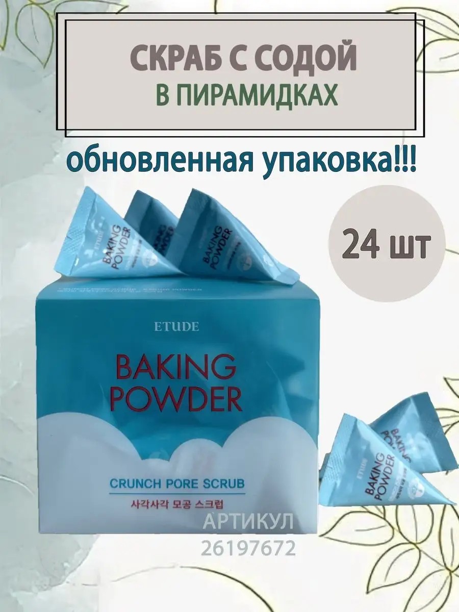 Скраб для лица с содой Etude House Baking Powder Crunch Pore Scrub на 40% состоит из мельчайших крупинок соды и за счет этого эффективно очищает поры от загрязнений, мягко отшелушивает омертвевшие частички кожи, стимулируя клеточное обновление, обеззараживает и оздоравливает тон лица. Корейский скраб Etude House мягко, но глубоко очищает поры от всех видов загрязнений, абсорбирует излишки кожного сала, оказывает отшелушивающее действие и полирует поверхность эпидермиса. Оказывает лёгкие охлаждающий эффект, сужает поры и освежает. Способ применения: Нанесите необходимое количество средства на влажную кожу лица избегая области вокруг глаз и губ. Помассируйте, особое внимание уделите T-зоне и проблемным участкам. Умойтесь теплой водой. Рекомендуется использовать 1-2 раза в неделю. Подходит для нормальной, жирной, комбинированной и проблемной кожи. Средство представлено в двух видах - оригинальном "порционном" виде - скраб в пирамидках по 7г/шт, и в тюбике 200 г. Оригинальная корейская косметика