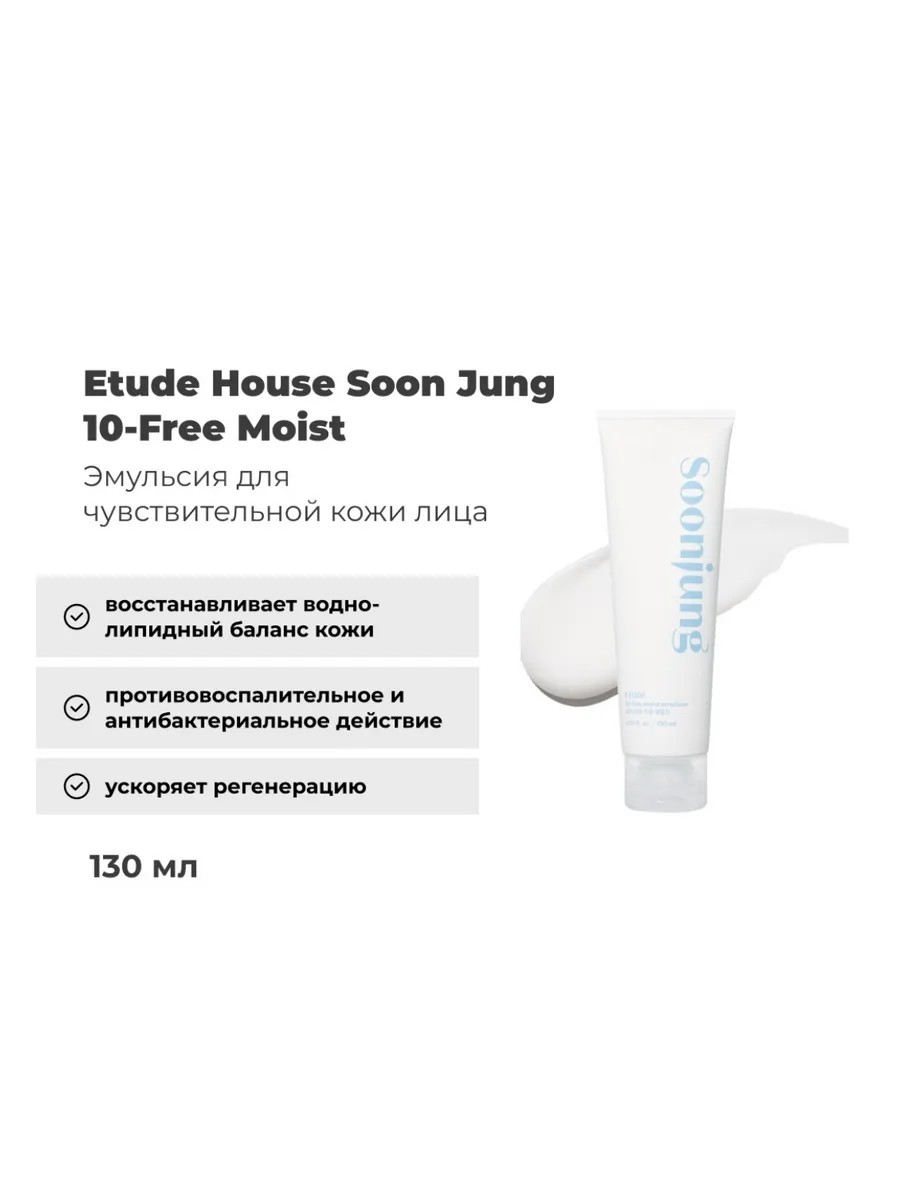 Etude house Soon Jung 10-Free Moist Emulsion is an emulsion for sensitive and damaged skin. Contains 93% natural ingredients that help relieve dryness and irritation, soothe and relieve stress, and protect the skin from external aggressors, restoring its barrier function. The emulsion's formula is slightly acidic, dermatologically tested, and non-comedogenic. It does not contain animal-derived ingredients, mineral oil, artificial colors or fragrances, polyacrylamide, silicones, imidazolidinyl urea, triethanolamine, PEG, or parabens. It contains the patented Panthenol and Madecassoside. Panthenol deeply moisturizes the skin, relieves itching and redness, and heals wounds and microtraumas. Madecassoside has unique anti-inflammatory properties, nourishes and soothes the skin, restores its protective barrier, and promotes collagen and elastin production.