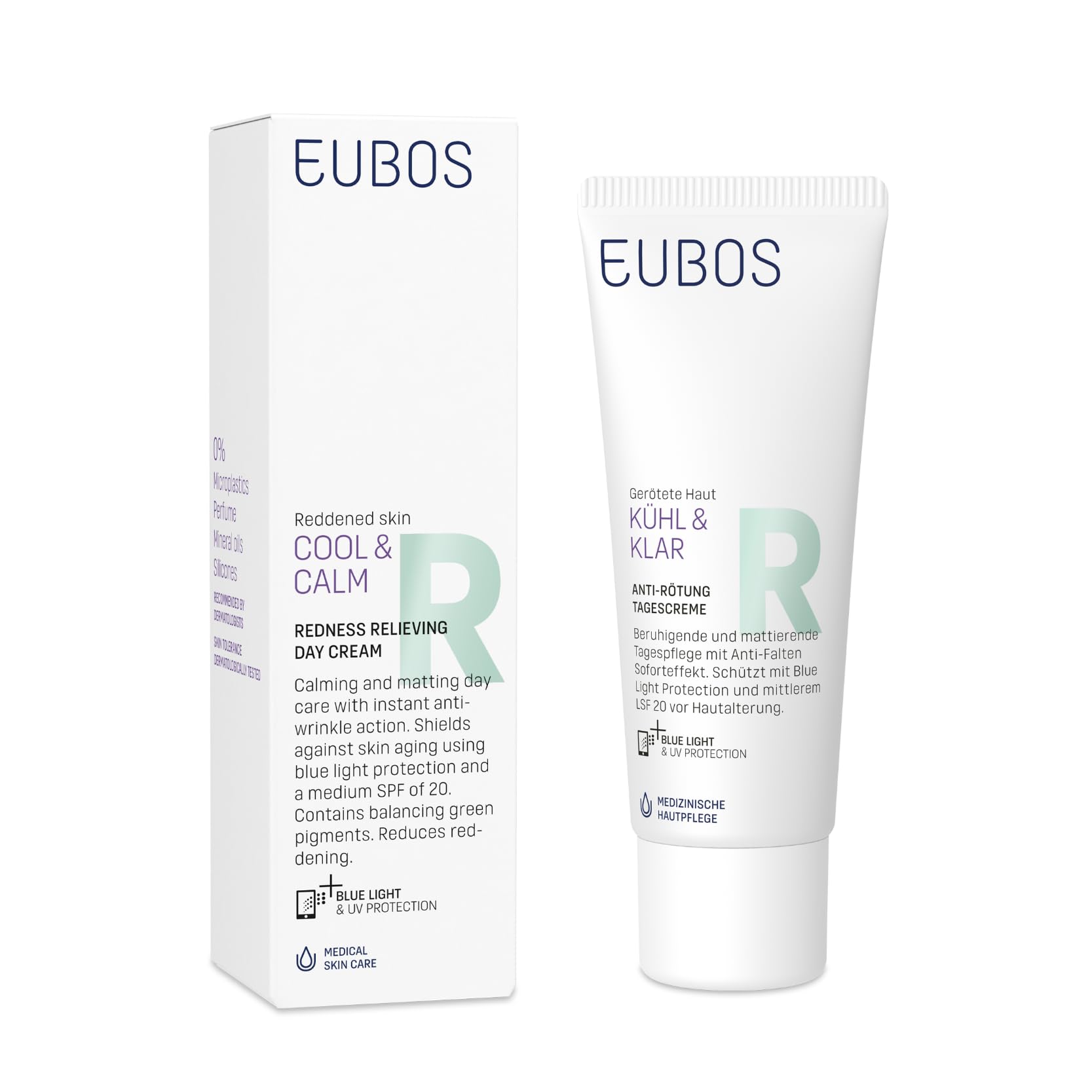Sensitive skin prone to redness, rosacea, or couperose needs special protection, especially against UV rays. EUBOS Cold Clear Anti-Redness Day Cream SPF 50 combines highly effective sun protection with soothing care. An innovative complex of phyto-actives with Italian helichrysum and CM-Naringenine Chalcone acts in a targeted way against redness, strengthens blood vessels, and reduces irritation. Added green pigments gently conceal redness for an even complexion. Ectoin offers cellular protection against UV damage and environmental aggressors and promotes skin smoothing. Panthenol and glycerin moisturize the skin and promote its elasticity. This Anti-Redness Day Cream SPF 50 thus combines anti-redness and anti-aging benefits. Free from fragrance, microplastics, PEGs, silicones, and hormonal UV filters, this vegan formula impresses with its high skin tolerance – dermatologically tested and made in Germany. Ideal for daily use, even under makeup. For visibly soothed, protected, and radiant skin every day. INGREDIENTS Aqua (Water) C12-15 Alkyl Benzoate Glycerin Bis-Ethylhexyloxyphenol Methoxyphenyl Triazine Diethylamino Hydroxybenzoyl Hexyl Benzoate Triheptanoin Phenylbenzimidazole Sulfonic Acid Arginine Ethylhexyl Triazole Dibutyl Adipate, CI 77891 (Titanium Dioxide), Potassium Cetyl Phosphate, Cetearyl Alcohol, Hydrogenated Palm Glycerides, Ectoin, Tocopheryl Acetate, Caprylyl Glycol, Panthenol, Diethylhexyl Syringylidenemalonate, Lauroyl Lyssopheryl Ine Sodium Polyethylene Phosphates, Sodium Stearoyl Glutamate, Sodium Cetearyl Sulfate, Glyceryl Caprylate, Dipropylene Glycol, Lysolecithin, Sclerotium Gum, Microcrystalline Cellulose, Mica, Xanthan Gum, Tetrasodium Tetracarboxymethyl, Tetracarboxymethyl, Pullulan, Hydrolyzed Algogen Caprylic Capric Triglycerides Gum Cellulose Sodium Citrate Silica Sodium Sulfate Helichrysum Italicum Extract Sodium Chloride CI 42051 (Acid Blue 3) CI 77288 (Chromium Oxide Greens) SAFETY WARNING For external use only See moreKind to skin and kind to the environment: vegan, fragrance-free, and microplastic-free. Even skin tone: green pigments instantly conceal redness. Ideal for rosacea and couperose: specially formulated for sensitive and reddened skin. UPF 50 : high UVA UVB protection without critical UV filters. Anti-redness: active plant-based complex that visibly reduces redness.EUBOS Froid et transparent Crème de jour anti-rougeurs SPF 50 – Crème de jour végétalienne pour la rosacée et la couperose Avec pigments verts et complexe phyto Apaise les peaux rougies Crème de jour SPF 50 40 mlDESCRIPTION DU PRODUIT DESCRIPTION DU PRODUIT Les peaux sensibles sujettes aux rougeurs, à la rosacée ou à la couperose ont besoin d'une protection particulière, en particulier contre les rayons UV. La crème de jour EUBOS Froid Clear anti-rougeurs SPF 50 allie une protection solaire très efficace et un soin apaisant. Un complexe innovant de phyto-actifs avec immortelle italienne et CM-Naringenine Chalcone agit de manière ciblée contre les rougeurs, renforce les vaisseaux et atténue les irritations. Les pigments verts ajoutés masquent en douceur les rougeurs pour un teint uniforme. Ectoin offre des propriétés de protection cellulaire contre les dommages UV et les agressions environnementales et favorise le lissage de la peau. Le panthénol et la glycérine hydratent la peau et favorisent son élasticité. La crème de jour anti-rougeurs SPF 50 combine ainsi anti-rougeurs et anti-âge. Sans parfum, microplastique, PEG, silicone et filtres UV hormonaux, la formule végétalienne convainc par sa haute tolérance cutanée – testée dermatologiquement et fabriquée en Allemagne. Idéal pour une utilisation quotidienne, même sous le maquillage. Pour une peau visiblement apaisée, protégée et éclatante tous les jours. INGRÉDIENTS Aqua (Water) C12-15Alkyl Benzoate Glycérine Bis-Ethylhexyloxyphenol Methoxyphenyl Triazine Diethylamino Hydroxybenzoyl Hexyl Benzoate Triheptanoine Phenylbenzimidazole Sulfonic Acid Arginine Ethylhexyl Triazole Zone Dibutyle Adipate, CI 77891 (Titanium Dioxide), Potassium Cetyl Phosphate, Cetearyl Alcohol, Hydrogenated Palm Glycerides, Ectoin, Tocopheryl Acetate, Caprylyl Glycol, Panthénol, Diéthylhexyl Syringylidenemalonate, Lauroyl Lyssopheryl ine Sodium Polyéthylène Phosphates, stéaroyl glutamate de sodium, sulfate de cétéaryle de sodium, caprylate de glycéryle, glycol de dipropylène, lysolecithine, gomme sclérotium, cellulose microcrystalline, mica, gomme xanthane, tétrasodium, tétracarboxyméthyle, charboxyméthyle, pullulan, algogène hydrolysé. dans Caprylice. Triglycérides Capric Gum Cellulose Citrate de sodium Silice Sulfate de sodium Extrait d'Helichrysum Italicum Chlorure de sodium CI 42051 (Acid Blue 3) CI 77288 (Chromium Oxide Greens) AVERTISSEMENT DE SÉCURITÉ Pour un usage externe uniquement Voir plusRespectueux de la peau et respectueux de l'environnement : végétalien, sans parfum, sans microplastique. Teint uniforme : les pigments verts cachent instantanément les rougeurs. Idéal en cas de rosacée et de couperose : spécialement conçue pour les peaux sensibles et rougies. UPF 50 : haute protection UVA UVB sans filtre UV critique. Anti-rougeurs : complexe actif végétal qui réduit visiblement les rougeurs.
