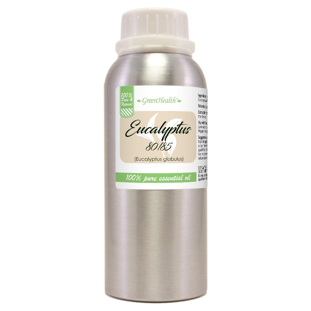 Eucalyptus Essential Oil (80 85) – 8 fl oz – Aluminum Bottle – 100 Pure Essential Oil – GreenHealthExperience the refreshing, invigorating aroma of GreenHealth Eucalyptus Essential Oil (80 85), a 100 pure and natural essential oil steam-distilled from the leaves of Eucalyptus globulus. With its crisp, camphoraceous scent, this versatile oil is perfect for aromatherapy, DIY personal care, and natural home cleaning applications.Key Benefits:✓ Cool, Fresh Aroma – Creates a revitalizing and energizing atmosphere.✓ Ideal for DIY Projects – Great for making candles, soaps, room sprays, and home fresheners.✓ Aromatherapy Essential – Commonly used in diffusers for an uplifting ambiance.✓ Natural Air Purifier – Enhances homemade cleaning blends with a crisp scent.✓ 100 Pure Undiluted – Free from synthetic additives, fillers, or chemicals.Product Details: Size: 8 fl oz Packaging: Durable aluminum bottle to protect against light and oxidation. Secure Cap: Leak-proof design for safe storage and dispensing. Sustainably Sourced: Responsibly harvested for premium quality and purity.How to Use: Aromatherapy: Add a few drops to a diffuser for a refreshing, crisp scent. DIY Creations: Blend into homemade candles, soaps, and natural air fresheners. Home Freshening: Mix with water or vinegar for a natural, clean-scented surface cleaner. Outdoor Use: Use in natural pest-repellent blends for outdoor spaces.Enjoy the cool, uplifting essence of GreenHealth Eucalyptus Essential Oil (80 85) – a must-have for aromatherapy and natural home care!