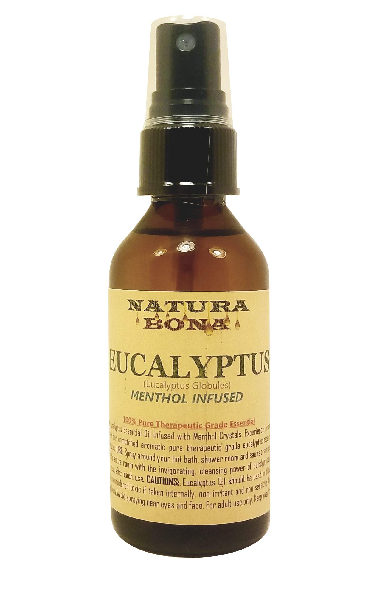 100 Pure Eucalyptus Oil please use sparingly. Only a small spray amount is needed. Freshen restrooms instantly. Provides help with respiratory inflammation. Removes stale air and eliminates smoke, food and pet odors. Enjoy all the aromatic and health benefits of pure eucalyptus essential oil. Use around your hot bath, shower room and sauna or any place where steam is generated to infuse the entire room with the invigorating, cleansing power of eucalyptus oil. Natura Bonas 100 pure eucalyptus essential oil Infused with Menthol Crystals for Steam Rooms and Showers 2 oz Amber Glass Fine Mist Spray Bottle.