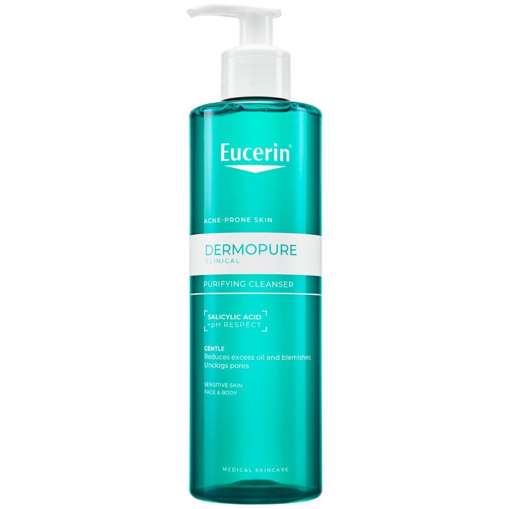 Package Contents - Eucerin DermoPurifyer Oil Control Cleansing Gel, Acne Facial Cleanser and Makeup Remover, Non-Comedogenic Fragrance-Free Cleanser, 1 x 400ml Box, Item Number: 88982. Eucerin Safety - This intensive facial cleansing gel is clinically and dermatologically tested and compatible with acne medication and can even be used during pregnancy. Active Ingredients - Enriched with salicylic acid and 6 amphora-surfactants, this combination skin facial cleanser with antibacterial properties eliminates bacteria from the skin and prevents their proliferation. DermoPurifyer - This facial cleansing foam is part of the Eucerin DermoPurifyer range, specially formulated to target the main causes of blemished and acne-prone skin. Eucerin DermoPurifyer Cleansing Gel.