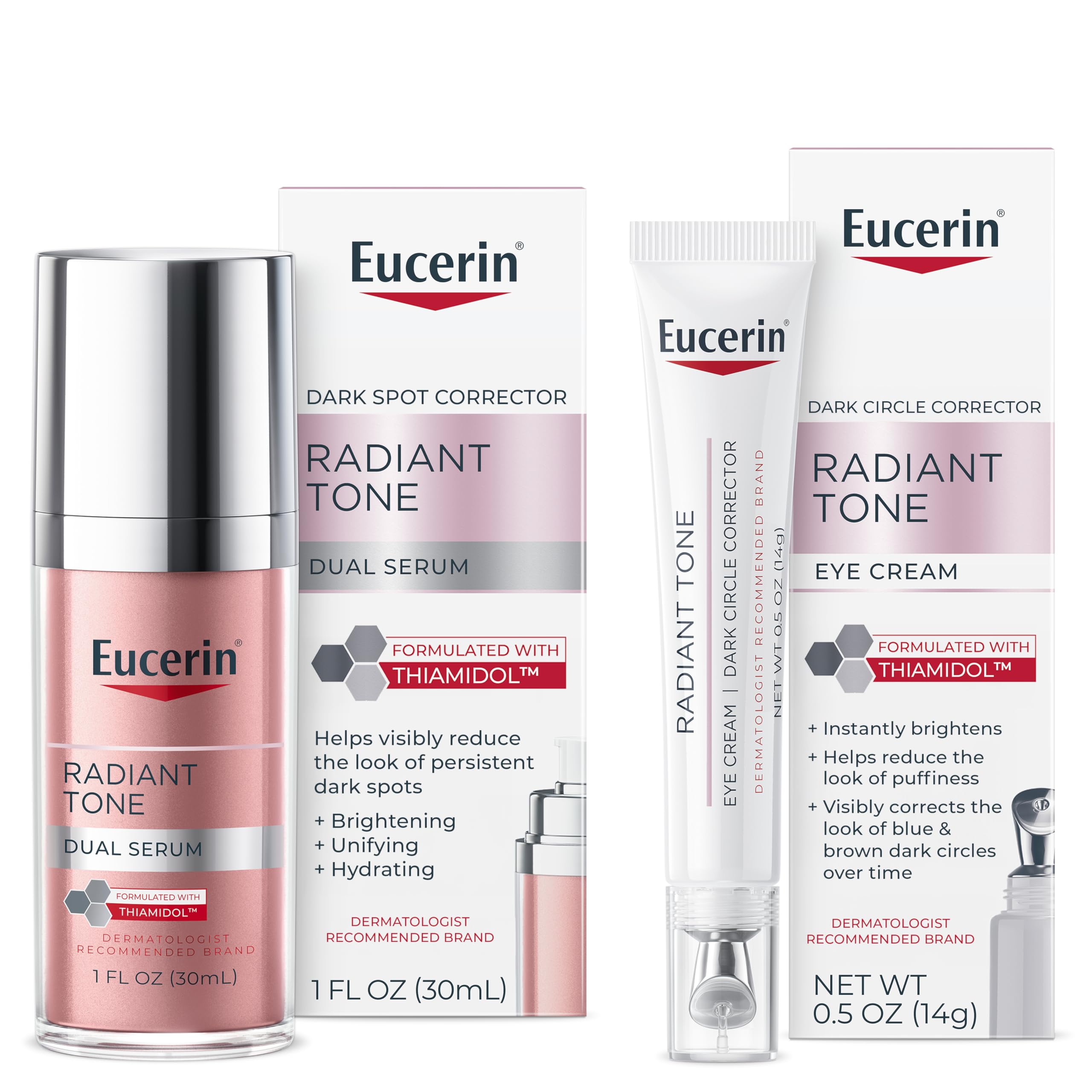 BUNDLE INCLUDES: One 1 fluid ounce bottle of Eucerin Radiant Tone Dual Serum, Dark Spot Corrector and one 0.5 ounce tube of Eucerin Radiant Tone Eye Cream Dark Circle Corrector skin correctors with Thiamidol and Hyaluronic Acid. FOR ALL SKIN TYPES: Facial serum and ophthalmologist-tested under eye cream have clinically proven formulas and are suitable for all skin types, even sensitive skin. INSTANTLY BRIGHTENS EYE AREA: Eye brightening cream with light-reflecting pigments that instantly deliver a brighter, more illuminated look the eye cream also instantly reduces the look of eye puffiness. YOUNGER LOOKING SKIN: Dark spot serum contains Hyaluronic Acid and helps smooth the look of fine lines and wrinkles the lightweight, non-sticky face moisturizer formula feels comfortable on skin and won't clog pores. REDUCE THE LOOK OF DARK CIRCLES AND SPOTS: Eucerin Radiant Tone Eye Cream and Facial Serum, both formulated with Thiamidol, help visibly correct the look of dark circles and dark spots over time with regular use.