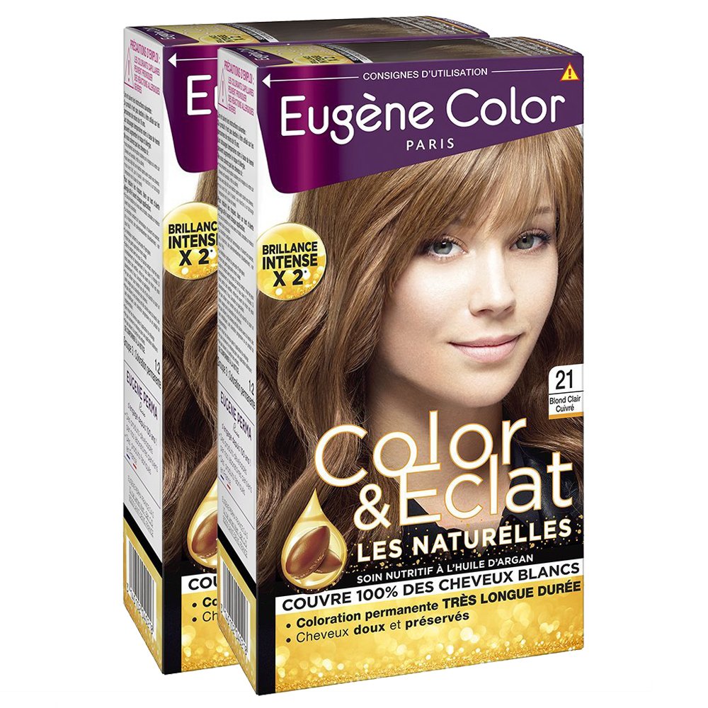 Intense shine permanent hair color kit. Subtle shades for hair with natural, soft, and intensely shiny highlights, for a very long-lasting color. Your Eugène Color Expert Colorist reveals the Color Eclat range. Color Eclat guarantees perfect coverage of gray hair, vibrant color, and a result up to 2.4 times shinier than that of uncolored hair. Color Eclat therefore combines intense shine and camouflaged gray hair for a very long time. Your color is enhanced and your hair soft and radiant with shine. With an exclusive composition of colorants, Color Eclat hair colors allow perfect adhesion of the color to the heart of the fiber. A treatment enriched with Argan Oil, known for its deeply nourishing and restorative properties, brings suppleness and strength to your hair.Designed and manufactured in France. This kit contains: 1 tube of coloring cream (33ml), 1 developer applicator bottle (67ml), 1 deep treatment sachet (15ml), 1 leaflet, 1 pair of gloves and 1 pair of glasses temple protectors. Treatment enriched with Argan Oil, known for its deeply nourishing and restorative properties for protected, supple and more resistant hair. Permanent coloring for soft, protected and shiny hair. Very long-lasting color. Kit de coloration permanente brillance intense. Des nuances subtiles pour des cheveux aux reflets naturels, tout doux et intensément brillants, pour une coloration d'une très longue durée. Votre Expert Coloriste Eugène Color vous dévoile la gamme Color Eclat. Color Eclat vous garantit une couverture parfaite des cheveux blancs, une couleur, éclatante et un rendu jusqu'à 2,4 fois plus brillant que celui d'une chevelure non colorée. Color Eclat conjugue donc brillance intense et cheveux blancs camouflés pendant très longtemps. Votre couleur est sublimée et votre chevelure douce et éclatante de brillance. Dotée d'une composition exclusive de colorants, les colorations Color Eclat permettent une adhésion parfaite de la couleur au coeur de la fibre. Un soin enrichi en Huile d'Argan, reconnue pour ses vertus profondément nourrissantes et réparatrices, apporte souplesse et résistance à votre chevelure.Imaginé et fabriqué en France. Ce kit contient : 1 tube de crème colorante (33ml), 1 flacon applicateur de révélateur (67ml), 1 sachet de soin profond (15ml), 1 notice, 1 paire de gants et 1 paire de protège-branches de lunettes. Soin enrichi en Huile d'Argan, reconnue pour ses vertus profondément nourrissantes et réparatrices pour des cheveux protégés, souples et plus résistants. Coloration permanente pour des cheveux doux, préservés et éclatants de brillance. Couleur très longue durée.