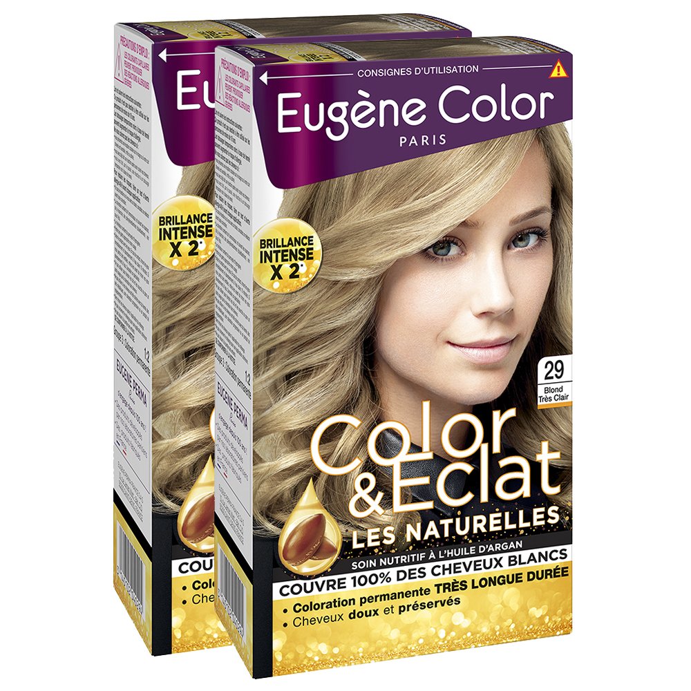 If women find themselves more than ever at their advantage when they have just done their coloring, it is of course because they have then made any white hair disappear but above all because their mane then shines with an incredible shine which is sometimes a little lacking. And if all the colorings offered by Eugène Color have always sought to give an intense light to our hair, Color Eclat intends to push its highlighting potential even further, for hair more vibrant than ever. COLOR above all because it of course offers total coverage of white hair and also guarantees a very long-lasting hold which allows the result offered by its exclusive combination of spherically selected dyes to be worn for a long time to ensure perfect adhesion of the color to the heart of the beer. Then ÉCLAT because it is a real performance offered by Color Éclat which promises a result up to 2.4 times brighter than that of uncolored hair. A blessing to be credited to its new coloring formula developed by Eugène Color experts to guarantee increased shine and hair as if infused with light. All this of course with the greatest respect for the hair oil and the scalp which will appreciate its treatment formula enriched with Argan oil for more supple and resistant hair. DIRECTIONS FOR USE Use: Carry out an allergy test, prepare the mixture, apply it to the hair and leave it for a while to allow the Argan oil to nourish and repair the hair.Made in France: Your Eugène Color coloring kit is designed and manufactured in France. This case contains: 1 tube of coloring cream (33ml), 1 developer applicator bottle (67ml), 1 deep treatment sachet (15ml), 1 instruction leaflet, 1 pair of gloves and 1 pair of glasses temple protectors. Contains a treatment enriched with Argan Oil, known for its deeply nourishing and restorative properties. Hair is protected, supple and more resistant. Perfect coverage of gray hair. Extreme shine color for vibrant hair and an ultra-natural result. Permanent color for soft, protected and shiny hair. Very long-lasting color. Si les femmes se trouvent plus que jamais à leur avantage alors qu'elles viennent tout juste de réaliser leur coloration, c'est bien entendu parce qu'elles ont alors fait disparaitre leurs éventuels cheveux blancs mais surtout parce que leur crinière resplendit alors d'une brillance inouïe qui parfois leur fait un peu défaut. Et si toutes les colorations proposées par Eugène Color ont toujours veillé à conférer une lumière intense à notre chevelure, Color Eclat entend bien repousser encore plus loin son potentiel enlumineur, pour des cheveux plus vibrants que jamais. COLOR avant tout car elle offre bien entendu une couvrante totale des cheveux blancs et garantit en prime une tenue très longue durée qui permet de porter longtemps du rendu offert par sa combinaison exclusive de colorants sphériquement sélectionnés pour assurer une parfaite adhésion de la couleur au cœur de la bire. Puis ÉCLAT car c'est une véritable performance qu'offre Color Éclat qui promet un rendu jusqu'à 2,4 fois plus brillant que celui d'une chevelure non colorée. Un bénie à créditer à sa nouvelle formule colorante développée par les experts Eugène Color pour garantir une brillance décuplée et des cheveux comme infusés de lumière. Tout cela bien entendu dans le plus grand respect de la bire capillaire et du cuir chevelu qui apprécieront sa formule-soin enrichie en huile d'Argan pour des cheveux plus souples et résistants. MODE D'EMPLOI Utilisation : Effectuez un test d'allergie, préparez le mélange, appliquez-le sur les cheveux et laissez-le poser pendant un certain temps pour permettre à l'huile d'Argan de nourrir et réparer les cheveux.Made in France : Votre kit de coloration Eugène Color est imaginé et fabriqué en France. Cet étui contient : 1 tube de crème colorante (33ml), 1 flacon applicateur de révélateur (67ml), 1 sachet de soin profond (15ml), 1 notice, 1 paire de gants et 1 paire de protège-branches de lunettes. Contient un soin enrichi en Huile d'Argan, reconnue pour ses vertus profondément nourrissante et réparatrice. Les cheveux sont protégés, souples et plus résistants. Couverture parfaite des cheveux blancs. Couleur brillance extrême pour des cheveux vibrants et un résultat ultra-naturel. Coloration permanente pour des cheveux doux, préservés et éclatants de brillance. Tenue de couleur très longue durée.