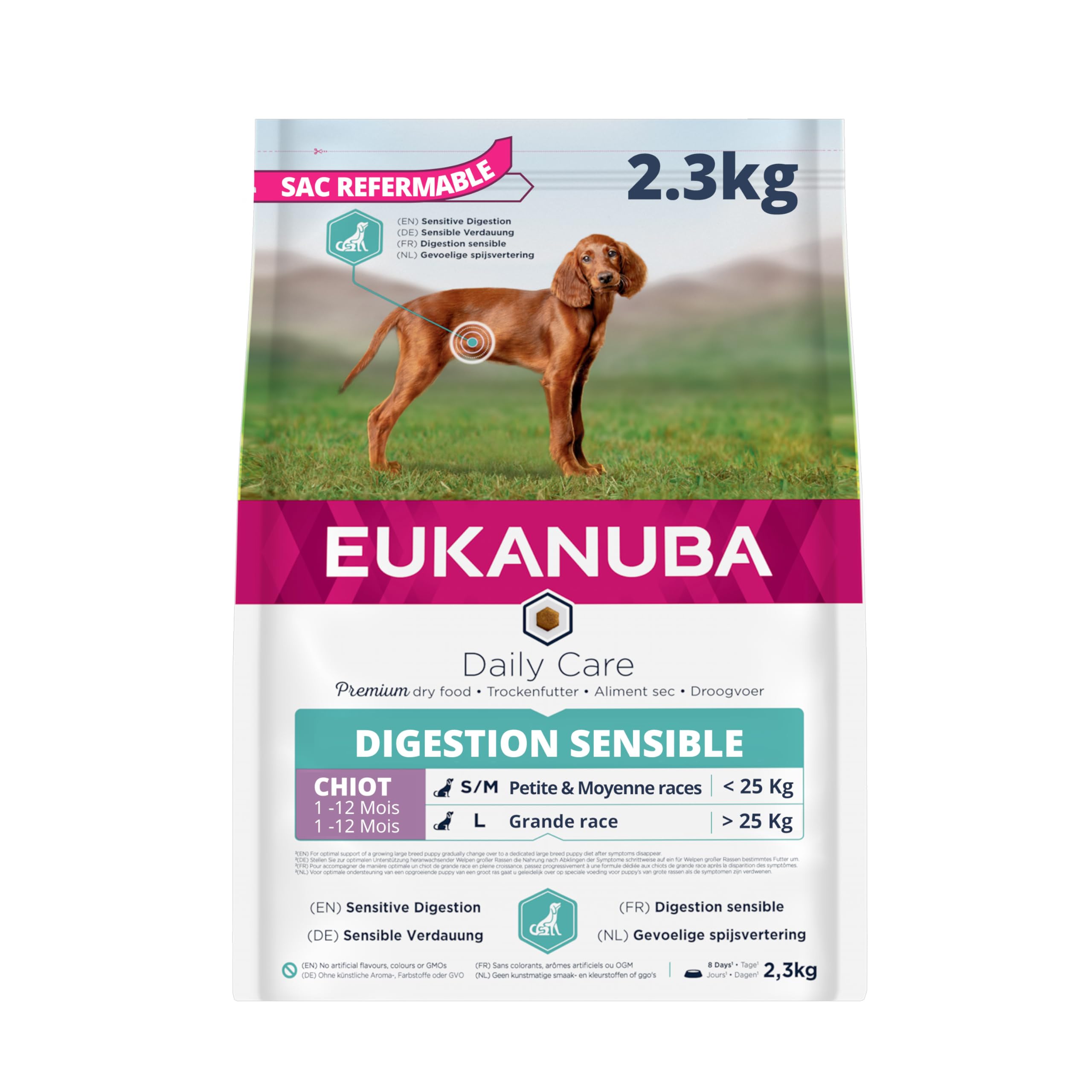 Eukanuba Daily Care puppy food. This fresh chicken dry food for puppies with sensitive digestion has been specially designed for dogs with sensitive stomachs. With easy-to-digest rice, this food offers an alternative for puppies with special nutritional needs. This formula supports the natural balance of intestinal flora and helps optimize nutrient absorption. Additionally, FOS MOS prebiotics as well as butyrate and beet pulp help support healthy digestion. For healthy skin and a shiny coat, this food contains natural sources of omega-6 and omega-3 fatty acids, and the calcium it contains promotes strong bones. Another important component of this food is DHA. This polyunsaturated fatty acid contributes to the healthy development of dogs, promotes trainability and helps them learn. EUKANUBA Daily Care dry food for puppies with sensitive digestion is 100 complete and balanced and has been specially designed to meet the needs of dogs with special nutritional requirements. INGREDIENTS Composition: dried chicken and turkey (30 including chicken 18 ), white rice, corn, fresh chicken (10 ), poultry fat, dried sugar beet pulp (3.9 ), chicken sauce, fish meal, minerals, fish oil, fructo-oligosaccharides (1 ), dried brewer's yeast, flaxseed, Charide mannanoligosaccharides (0.13 ), microencapsulated sodium butyrate (0.1 ). Analytical constituents: protein: 31 , fat content: 20.8 , omega-6 fatty acids: 2.21 , omega-3 fatty acids: 0.27 , DHA: 0.18 , crude ash: 6.8 , crude fiber: 1.5 , calcium: 1.25 , phosphorus: 1.04 . Additives: ( kg), vitamins: vitamin A 41250IE, vitamin C: 52 mg, vitamin D 1369IE, vitamin E 450 mg, beta-carotene 4.5 mg. Copper (II) amino acid chelate: 12 mg, Iodine (calcium iodate, anhydrous): 2.4 mg, Iron (II) amino acid chelate Hydrate: 64 mg, Manganese (amino acids, manganese), hydrate: 37 mg, Zinc (amino acid, chelate, hydrate): 106 mg. g, selenium (Na. Selenite): 0.02 mg. Contents included at time of manufacture. DIRECTIONS FOR USE Store in a cool, dry place Rich in high-quality protein-rich chicken for the development of strong, lean muscles, no artificial colors, flavors, or GMOs Scope of delivery: 1 x 2.3 kg dry puppy food. With natural sources of omega-6 and omega-3, the puppy food supports healthy skin and a shiny coat, calcium promotes the building and maintenance of strong bones. The puppy-friendly formula contains DHA, this polyunsaturated fatty acid contributes to the healthy development of puppies, promotes trainability, and helps them learn. The food contains easily digestible rice, as well as a special blend of prebiotic FOS and MOS, butyrate, and beet pulp to support healthy digestion. Premium food for puppies with a sensitive stomach and sensitive digestion, suitable for junior dogs aged 1 to 12 months. Nourriture pour chiots Eukanuba Daily Care. Cette nourriture sèche au poulet frais pour chiots à digestion sensible a été spécialement conçue pour les chiens à estomac sensible. Avec du riz facile à digérer, cette nourriture offre une alternative pour les chiots ayant des besoins nutritionnels particuliers. Cette formule soutient l'équilibre naturel de la flore intestinale et aide à optimiser l'absorption des nutriments. En outre, les prébiotiques FOS MOS ainsi que le butyrate et la pulpe de betterave contribuent à favoriser une digestion saine. Pour une peau saine et un pelage brillant, cette nourriture contient des sources naturelles d'acides gras oméga-6 et oméga-3, et le calcium contenu favorise des os solides. Un autre composant important de cette nourriture est le DHA. Cet acide gras polyinsaturé contribue au développement sain des chiens, favorise la capacité de dressage et les aide à apprendre. La nourriture sèche EUKANUBA Daily Care pour chiots à digestion sensible est 100 complète et équilibrée et a été spécialement conçue pour répondre aux besoins des chiens ayant des besoins nutritionnels particuliers. INGRÉDIENTS Composition : poulet et dinde séchés (30 dont poulet 18 ), riz blanc, maïs, poulet frais (10 ), graisse de volaille, pulpe de betterave sucrière séchée (3,9 ), sauce de poulet, farine de poisson, minéraux, huile de poisson, fructo-oligosaccharides (1 ), levure de bière séchée, graines de lin, mannanoligosaccharides Charide (0. 13 ), butyrate de sodium microencapsulé (0,1 ). Constituants analytiques : protéines : 31 , teneur en matières grasses : 20,8 , acides gras oméga-6 : 2,21 , acides gras oméga-3 : 0,27 , DHA : 0,18 , cendres brutes : 6,8 , fibres brutes : 1,5 , calcium : 1,25 , phosphore : 1,04 . Additifs : ( kg), vitamines : vitamine A 41250IE, vitamine C : 52 mg, vitamine D 1369IE, vitamine E 450 mg, bêta-carotène 4,5 mg. Chélate d'acide aminé cuivre (II) : 12 mg, iode (iodate de calcium, anhydre) : 2,4 mg, fer (II) chélate d'acide aminé Hydraté : 64 mg, manganèse (acides aminés, manganèse), hydrate : 37 mg, zinc (acide aminé, chélate, hydraté) : 106 mg. g, sélénium (Na. Sélénite) : 0,02 mg. Teneurs incluses au moment de la fabrication. MODE D'EMPLOI Conserver dans un endroit frais et sec Riche en poulet riche en protéines de haute qualité pour le développement de muscles forts et minces, sans colorants ni arômes artificiels ni OGM Contenu de la livraison : 1 x 2,3 kg de nourriture sèche pour chiots. Avec des sources naturelles d'oméga-6 et d'oméga-3, la nourriture pour chiots soutient une peau saine et un pelage brillant, le calcium favorise la construction et le maintien d'os solides. La formule adaptée aux chiots contient du DHA, cet acide gras polyinsaturé contribue au développement sain des chiots, favorise la capacité d'entraînement et les aide à apprendre. La nourriture contient du riz facile à digérer, ainsi qu'un mélange spécial de FOS prébiotiques et de MOS, de butyrate et de pulpe de betterave pour favoriser une digestion saine. Nourriture de qualité supérieure pour chiots avec un estomac sensible et une digestion sensible, convient aux chiens