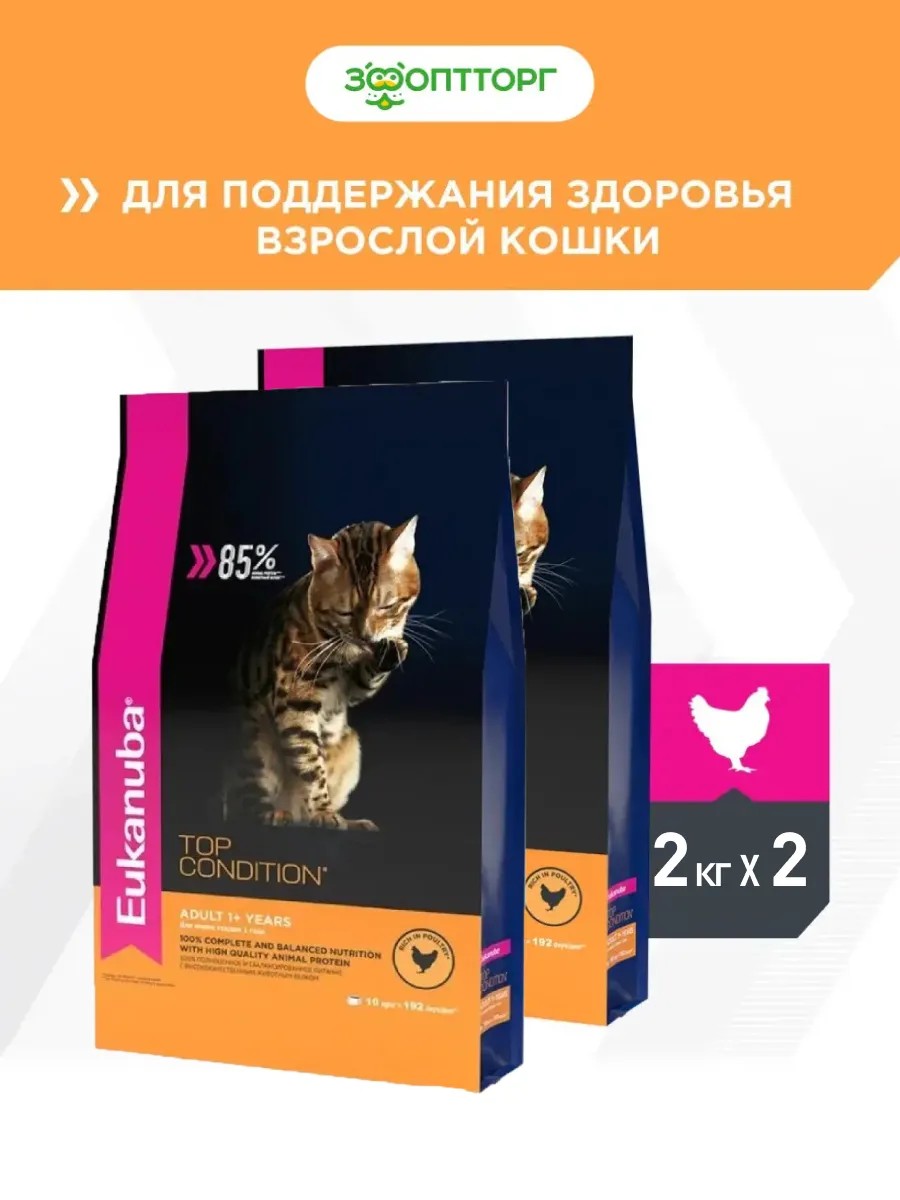 КомплектацияEukanuba Cat для взрослых кошек Домашняя птица, 2 кг .- 2 шт