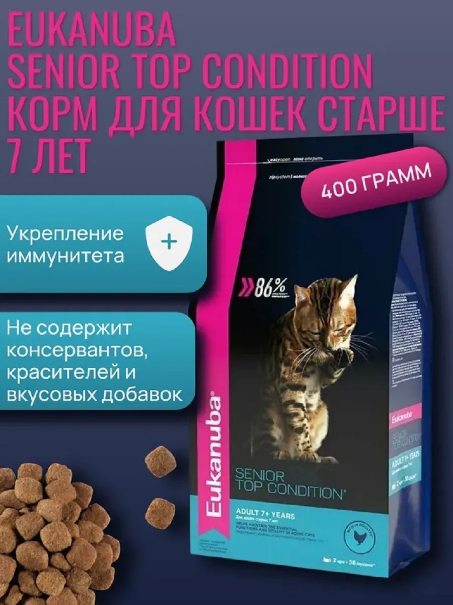 Сухой корм EUKANUBA ADULT 7+ YEARS SENIOR TOP CONDITION (ЭДАЛТ 7+ ЛЕТ СИНЬОР ТОП КОНДИШН) для кошек старше 7 лет - полнорационный корм, который содержит все необходимые питательные вещества, в том числе антиоксиданты, которые помогают поддержать здоровье стареющего питомца