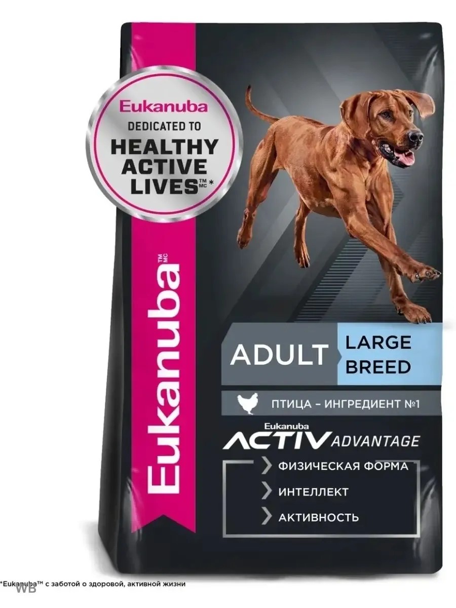 Корм сухой для взрослых собак крупных и очень крупных пород весом более 25 кг от года и старше с птицей. ПТИЦА - ИНГРЕДИЕНТ №1.