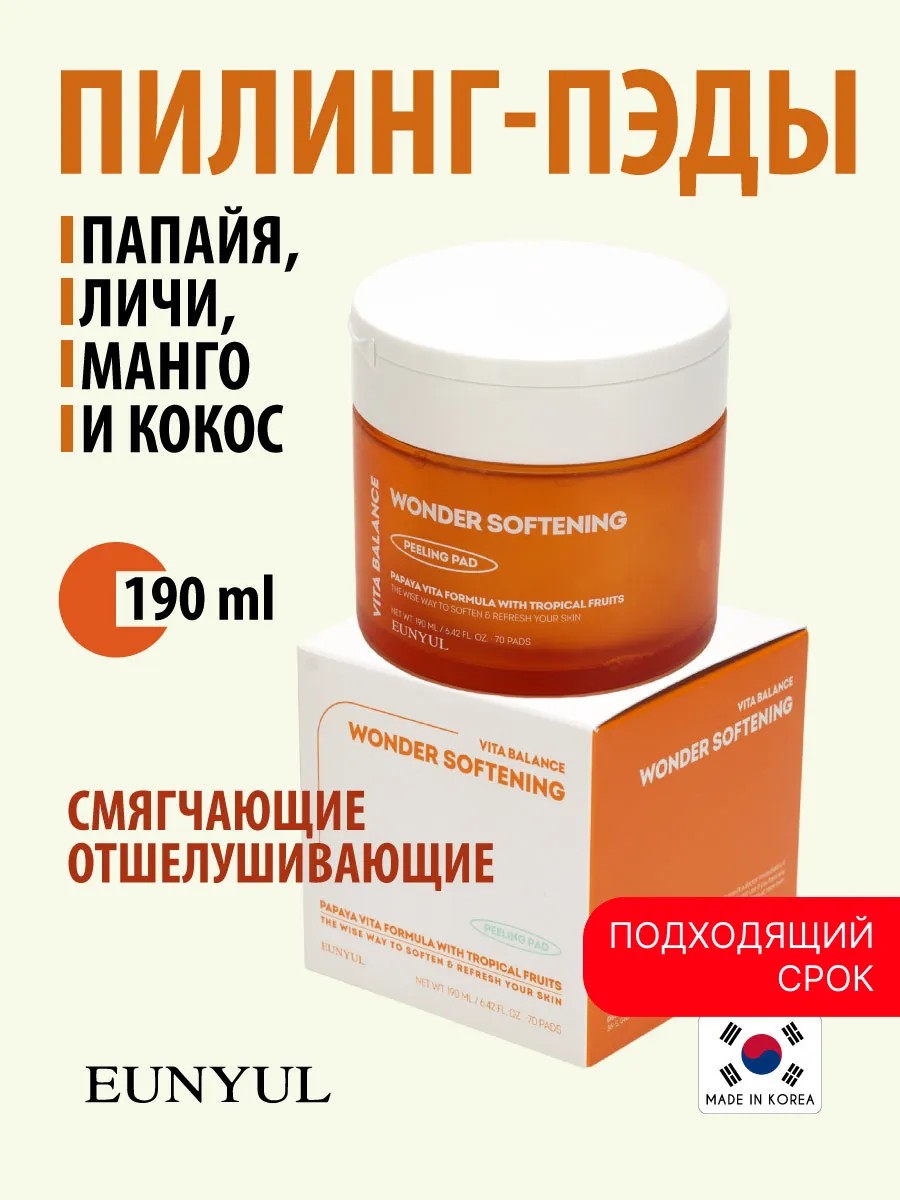 Смягчающие отшелушивающие пилинг-пэды удаляют омертвевшие клетки и загрязнения с кожи благодаря натуральным экстрактам папайи манго личи кокоса и пантенолу, которые также увлажняют и успокаивают кожу. Эти пилинг-пэды помогают обновить кожу, улучшить ее текстуру и тонус, а также подготовить ее к дальнейшему уходу. Они идеально подходят для всех типов кожи, в том числе для чувствительной, и могут использоваться как ежедневный уход или как дополнение к регулярному пилингу. После использования кожа становится более гладкой, свежей и сияющей. Применение: извлечь подушечку из упаковки и протереть очищенную сухую кожу от центра лица к линии роста волос. Сначала использовать рифленую сторону, а затем гладкую для того, чтобы отполировать кожу. Идеальный подарок женщине, маме, подруге, девушке и любимой на день рождения, новый год, 8 марта, день Святого Валентина. Рекомендуется к использованию в комплексе с серией корейской косметики для ухода за лицом и телом EYNYUL.