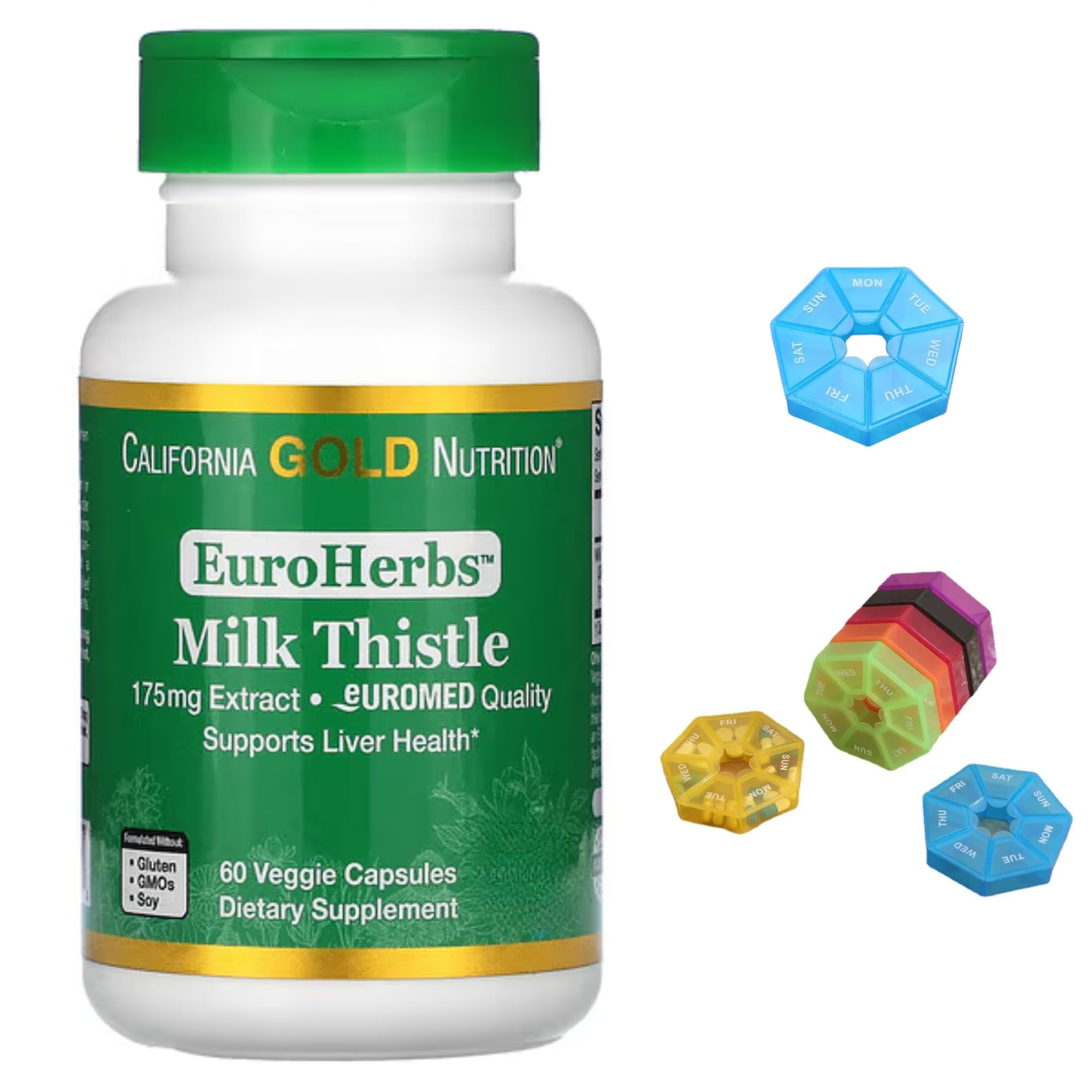 EuroHerbs Milk Thistle Extract Compatible With California Gold Nutrition Euromed Quality 175 mg 60 Veggie Capsules + Bonus Pill Organizer Weekly Pill Organizer Mini