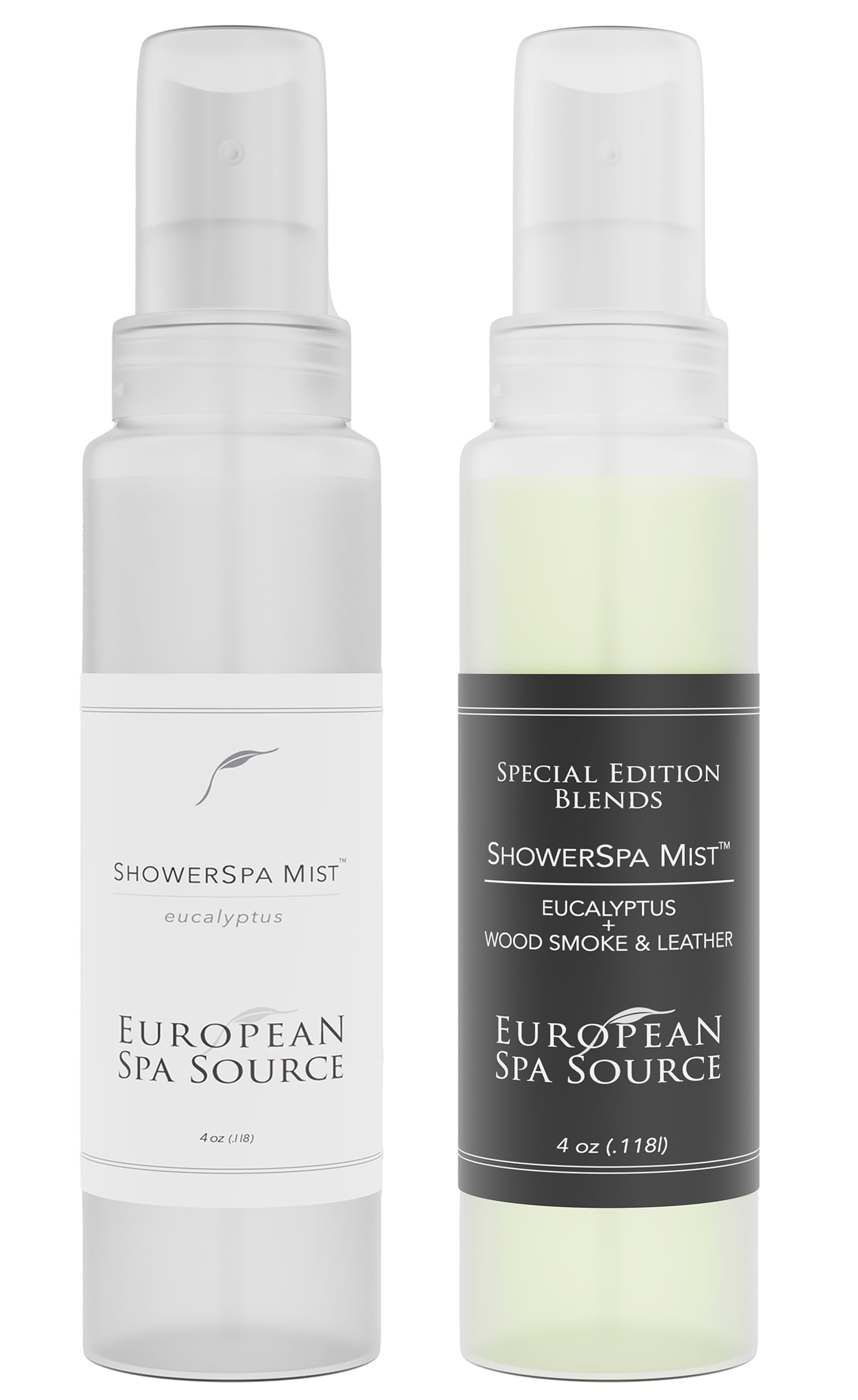 European Spa Source ShowerSpa Mist Spray Bundle (Classic Eucalyptus & Woodsmoke + Leather) for Aromatherapy at Home Spa Experience Sinus Congestion Relief and Tension Relief 4 fl oz. (Each)