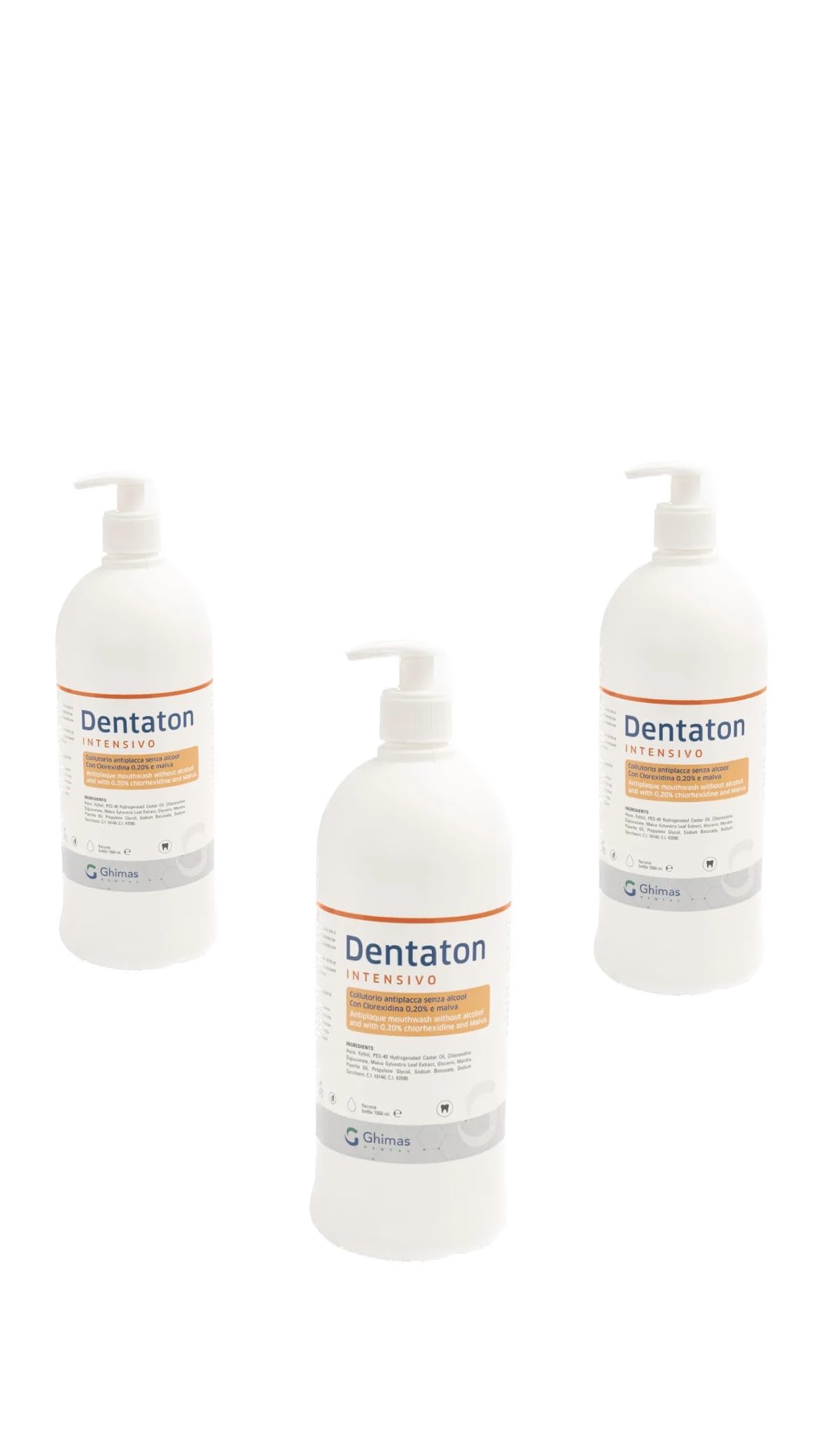 v Dentaton 0.20 is an anti-plaque mouthwash containing chlorhexidine, with intensive action. v Chlorhexidine is an antibacterial substance that remains effective for a long time without causing tissue damage or delaying healing. Clinical studies indicate that, even without good oral hygiene, chlorhexidine, when used consistently, acts as a bactericide on the surface of teeth, preventing plaque formation. v The mallow fluid extract has a soothing, local anti-irritant, refreshing action on the mucous membranes and helps eliminate toxins. v Directions for use: After performing your usual oral hygiene with a toothbrush and toothpaste, rinse your mouth thoroughly for at least one minute twice a day (preferably after breakfast and in the evening before bedtime), using 10 to 15 ml of mouthwash. It is advisable not to smoke or ingest coloring substances, such as coffee, tea, or wine, for at least two hours after treatment. v With dispenserA comprehensive mouthwash that addresses the main oral hygiene problems: plaque, tartar, cavities, sensitive gums, and bad breath. v 100 Made in Italy: Designed, formulated, and manufactured at the Ghimas Spa factory. v Good oral hygiene is essential chlorhexidine, when used consistently, acts as a bactericide on the surface of teeth, preventing plaque buildup. v Directions for use: After your usual oral hygiene routine with a toothbrush and toothpaste, rinse your mouth thoroughly for at least one minute twice a day. v The mallow fluid extract has a soothing, anti-irritant, and refreshing effect on the mucous membranes, and helps eliminate toxins. v Chlorhexidine is an antibacterial substance that remains effective for a long time without damaging tissues or delaying healing. Dentaton is an intensive anti-plaque mouthwash containing 0.20 chlorhexidine. v COLLUTOUR TOTAL ACTION against the main oral hygiene problems: plaque, tartar, cavities, sensitive gums and bad breath.Dentaton rince-bouche anti-plaque 3 flacons de 1 l avec extrait de mauve sans alcool à la chlorhexidine 0,20 , réduit les caries, garantit des gencives sainesDESCRIPTION DU PRODUIT v Dentaton 0,20 est un bain de bouche antiplaque, contenant de la chlorhexidine, avec action intensive. v La chlorhexidine est une substance antibactérienne qui reste efficace pendant longtemps sans causer de dommages aux tissus, ni retarder la cicatrisation. Des études cliniques indiquent que, même en l'absence d'une bonne hygiène de la cavité buccale, la chlorhexidine utilisée avec constance agit comme bactéricide sur la surface des dents, prévenant la formation de la plaque. v L'extrait fluide de mauve possède une action apaisante, anti-irritante locale, rafraîchissante des muqueuses et d'élimination des substances toxiques. v Conseils d'utilisation : après avoir effectué une hygiène buccale habituelle avec une brosse à dents et du dentifrice, rincer soigneusement la cavité buccale pendant au moins une minute deux fois par jour (de préférence après le petit déjeuner du matin et le soir avant le coucher), en utilisant 10 à 15 ml de bain de bouche. Il est conseillé de ne pas fumer ou avaler des substances colorantes, telles que le café, le thé ou le vin, pendant au moins deux heures après le traiv Avec doseurCollutoire à action totale contre les principaux problèmes d'hygiène bucco-dentaire : plaque, tartre, caries, gencives délicates et mauvaise haleine. v 100 fabriqué en Italie : conçu, formulé et fabriqué dans l'usine de Ghimas Spa. v Une bonne hygiène de la cavité buccale, la chlorhexidine utilisée avec constance agit comme bactéricide sur la surface des dents, évitant la formation de la plaque dentaire. v Conseils d'utilisation : après avoir effectué l'hygiène buccale habituelle avec une brosse à dents et du dentifrice, rincer soigneusement la cavité buccale pendant au moins une minute deux fois par jour. v L'extrait fluide de mauve possède une action apaisante, anti-irritante locale, rafraîchissante des muqueuses et d'élimination des substances toxiques. v La chlorhexidine est une substance antibactérienne qui reste efficace pendant longtemps sans causer de dommages aux tissus, ni retarder la cicatrisation. Dentaton est un bain de bouche anti-plaque intensif, contenant 0,20 chlorhexidine. v COLLUTOUR À ACTION TOTALE contre les principaux problèmes d'hygiène bucco-dentaire : plaque, tartre, caries, gencives délicates et mauvaise haleine.