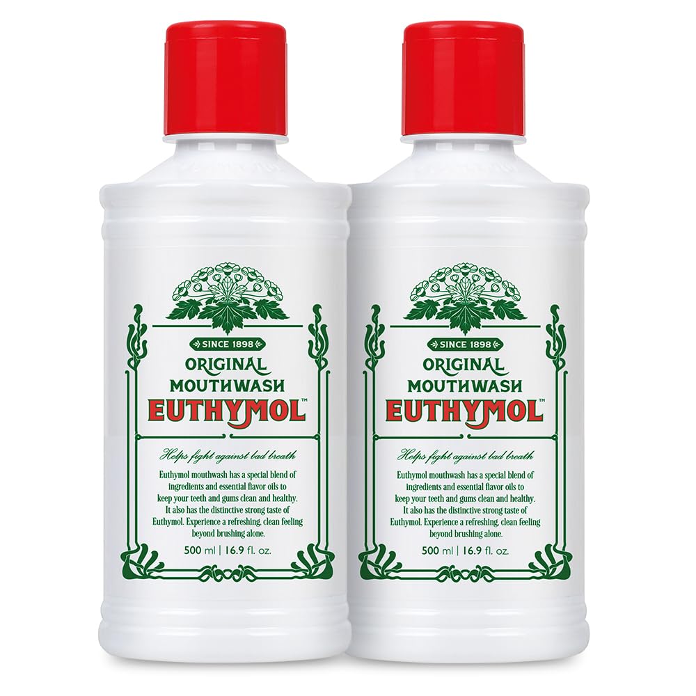 Euthymol Mouthwash Original 500ml x 2, Fluoride Free, Signature Strong Taste, Reduces Plaque, Cleans Gingiva, Healthy Teeth and Gums, Freshens Breath, Refreshing Daily Oral and Dental Care, Classic British Oral Care Brand: Boost Your Oral Hygiene Routine With Euthymol Mouthwash, A Famous Brand In The UK Since 1898. Signature Strong Taste: Experience a Refreshing and Clean Sensation with Euthymol Mouthwash's Special Blend of Ingredients and its Signature Strong Taste. INSTRUCTIONS FOR USE Shake the mouthwash in your mouth for 30 seconds and then spit it out. Do not swallow. SAFETY WARNING No ingestion. Avoid contact with the eyes. If swallowed, consult a doctor immediately. See moreTrusted by generations in the UK: Embrace a refreshing daily oral care routine with Euthymol Mouthwash, a brand trusted by generations for its effectiveness and distinctive taste. Fights Bad Breath with Vitamin E: Euthymol Mouthwash contains Vitamin E, which helps fight bad breath while preserving the mouth's natural environment. Reduces plaque and promotes healthy teeth and gums: The antibacterial formulation, including eucalyptus and thymol, helps reduce plaque, ensuring clean and healthy teeth and gums. Completely clean: Feel the invigorating tingle as Euthymol cleanses every corner of your mouth, leaving you feeling fresh and healthy. Distinctive Strong Taste: Experience a refreshing and clean sensation with Euthymol Mouthwash's special blend of ingredients and its signature strong taste. Classic British oral care brand: enhance your oral hygiene routine with Euthymol Mouthwash, a famous brand in the UK since 1898.Euthymol Mondspoeling Original 500ml x 2, Fluoridevrij, Intense Smaak, Vermindert Tandplak, Gezonde Tanden Tandvlees, Verfrist de Adem, Dagelijkse Mondverzorging Euthymol Mondwater Origineel 500 ml x 2, Fluoride Vrij, Kenmerkende Sterke Smaak, Vermindert Plaque, Reinigt Gingiva, Gezonde Tanden en Tandvlees, Verfrist Adem, Verfrissende Dagelijkse Mond- en Tandverzorging, Klassiek Brits Mondverzorgingsmerk: Verhoog Uw Mondhygiëne Routine Met Euthymol Mondwater, Een Beroemde Merk In Het VK Sinds 1898.Kenmerkende Sterke Smaak: Ervaar Een Verfrissende En Schone Sensatie Met De Speciale Mix Van Ingrediënten Van Euthymol Mondwater En Zijn Kenmerkende Sterke Smaak. GEBRUIKSAANWIJZING Schud het mondwater 30 seconden lang in de mond en spuug het dan uit. Niet inslikken. VEILIGHEIDSWAARSCHUWING Geen inslikken. Vermijd contact met de ogen. Bij inslikken onmiddellijk een arts raadplegen. Meer bekijkenVertrouwd door generaties in het Verenigd Koninkrijk: omarm een verfrissende dagelijkse mondverzorgingsroutine met Euthymol Mouthwash, een merk dat door generaties wordt vertrouwd vanwege zijn effectiviteit en onderscheidende smaak. Bestrijdt slechte adem met vitamine E: Euthymol Mondwater bevat vitamine E, dat helpt bij het bestrijden van slechte adem terwijl de natuurlijke omgeving van de mond wordt behouden. Vermindert tandplak en bevordert gezonde tanden en tandvlees: de antibacteriële formulering, inclusief eucalyptus en thymol, helpt tandplak te verminderen, waardoor schone en gezonde tanden en tandvlees worden gegarandeerd. Volledig schoon: Voel de verkwikkende tinteling terwijl Euthymol elke hoek van je mond reinigt en je een fris en gezond gevoel geeft. Onderscheidende Sterke Smaak: Ervaar een verfrissende en schone sensatie met de speciale mix van ingrediënten van Euthymol Mondwater en zijn kenmerkende sterke smaak. Klassiek Brits merk voor mondverzorging: verbeter je mondhygiëne routine met Euthymol Mondwater, een beroemd merk in het Verenigd Koninkrijk sinds 1898.