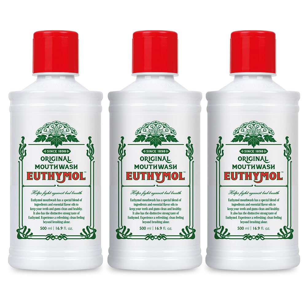 INSTRUCTIONS FOR USE Fresh breath as part of daily oral care SAFETY WARNING Don't swallow. Seek immediate medical attention if swallowed.Trusted by generations in the UK: Embrace a refreshing daily oral care routine with Euthymol Mouthwash, a brand trusted by generations for its effectiveness and distinctive taste. Fights Bad Breath with Vitamin E: Euthymol Mouthwash contains Vitamin E, which helps fight bad breath while preserving the mouth's natural environment. Reduces plaque and promotes healthy teeth and gums: The formulation, including eucalyptus and thymol, helps reduce plaque, ensuring clean and healthy teeth and gums. Completely clean: Feel the invigorating tingle as Euthymol cleanses every corner of your mouth, leaving you feeling fresh and healthy. Distinctive strong taste: Experience a refreshing and clean sensation with Euthymol Mouthwash's special blend of ingredients and its signature strong taste. Classic British oral care brand: enhance your oral hygiene routine with Euthymol Mouthwash, a famous brand in the UK since 1898.Euthymol Mouthwash Original 500mlx 3, Fluoridevrij, Intense Smaak, Vermindert Tandplak, Gezonde Tanden Tandvlees, Verfrist de Adem, Dagelijkse Mondverzorging GEBRUIKSAANWIJZING Frisse adem als onderdeel van de dagelijkse mondverzorging VEILIGHEIDSWAARSCHUWING Niet slikken. Zoek onmiddellijk medische hulp bij inslikken.Vertrouwd door generaties in het Verenigd Koninkrijk: omarm een verfrissende dagelijkse mondverzorgingsroutine met Euthymol Mouthwash, een merk dat door generaties wordt vertrouwd vanwege zijn effectiviteit en onderscheidende smaak. Bestrijdt slechte adem met vitamine E: Euthymol Mondwater bevat vitamine E, dat helpt bij het bestrijden van slechte adem terwijl de natuurlijke omgeving van de mond wordt behouden. Vermindert tandplak en bevordert gezonde tanden en tandvlees: de formulering, inclusief eucalyptus en thymol, helpt tandplak te verminderen, waardoor schone en gezonde tanden en tandvlees worden gegarandeerd. Volledig schoon: Voel de verkwikkende tinteling terwijl Euthymol elke hoek van je mond reinigt en je een fris en gezond gevoel geeft. Onderscheidende sterke smaak: Ervaar een verfrissende en schone sensatie met de speciale mix van ingrediënten van Euthymol Mouthwash en zijn kenmerkende sterke smaak. Klassiek Brits merk voor mondverzorging: verbeter je mondhygiëne routine met Euthymol Mondwater, een beroemd merk in het Verenigd Koninkrijk sinds 1898.