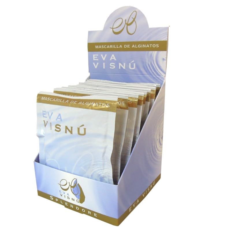 Eva Visnú's alginate mask is distinguished by its great moisturizing power, because it provides the skin with remineralizing, decongestant, firming and restorative properties of the natural hydrolipidic mantle. What stands out in its formula is the supplied mixture of alginates, diatomite and plant extracts (arnica, centaury, green tea and vitamin B5). Indications It can be used in any hygiene, moisturizing and aging facial treatment that does not contraindicate cold technique. Recommended for all skin types, including the most sensitive and reactive skin. Use: measure 90 ml of mineral water at room temperature (you can prepare it before the start of the treatment and book it for the time to have the ideal temperature). Place the entire contents of a bag in a bowl and mix with the water at room temperature with a plastic spatula until it becomes lump-free (approx. 3 minutes). Apply to the facial skin with the same spatula, forming a thick layer of approximately 3 mm, paying particular attention to the edges so that it can be removed cleanly. Use on eyes and lips is recommended, provided the person being treated is not claustrophobic. Let stand for 20 minutes. After this time, remove from bottom to top and remove the mask. It is recommended to stop treatment with a protection factor. Important active ingredients alginates: they are extracted from the algae "Laminaria Digita" and provide calcium and magnesium with revitalizing and regenerating properties. As a polysaccharide, it gels when mixed with water, creating a homogeneous coverage by providing an occlusion film that allows the penetration of the other active ingredients of the formula. DIATOMEN, BOTANICAL EXTRACTS AND VITAMIN B5In single dose bags. With plant extracts (arnica, centaury, green tea). Remineralizing. Firming. decongestant. moisturizers.Alginate Splendore masker, verpakking met 10 alginaatmaskers in een enkele dosis van 30 g, met remineraliserende, decongestieve eigenschappen, verstevigend en herstellend voor de Het alginaatmasker van Eva Visnú onderscheidt zich door zijn grote vochtkracht, doordat het de huid remineraliserende, decongestileerde, verstevigende en herstellende eigenschappen van de natuurlijke hydrolipidemantel geeft. In zijn formule onderscheidt zich het geleverde mengsel van alginaten, kiezelgoer en plantenextracten (arnica, duizendguldenkruid, groene thee en vitamine B5). Indicaties Het kan worden gebruikt in elke hygiëne, hydraterende en verouderende gezichtsbehandeling die geen koudetechniek heeft gecontra-indiceerd. Aanbevolen voor alle huidtypes, inclusief de meest gevoelige en reactieve huid. Gebruik: meet 90 ml mineraalwater op kamertemperatuur (je kunt het voorbereiden voor het begin van de behandeling en het boeken voor het tijdstip om de ideale temperatuur te hebben). Doe de volledige inhoud van een zak in een kom en meng met het water bij kamertemperatuur met een kunststof spatel tot hij klontervrij wordt geleerd (ca. 3 minuten) Met dezelfde spatel op de gezichtshuid aanbrengen en een dikke laag van ca. 3 mm vormen, waarbij bijzondere aandacht wordt besteed aan de randen, zodat hij schoon kan worden verwijderd. Het gebruik op ogen en lippen wordt aanbevolen, op voorwaarde dat de te behandelen persoon niet claustrofobisch is. Laat 20 minuten staan. Na afloop van deze tijd van beneden naar boven verwijderen en het masker verwijderen. Het wordt aanbevolen om de behandeling met een beschermingsfactor te stoppen. Belangrijke werkzame stoffen alginaten: ze worden door extractie van de alg "Laminaria Digita" gewonnen en leveren calcium en magnesium met revitaliserende en regenererende eigenschappen. Als polysacharide geleert het wanneer het met water wordt gemengd, waardoor een homogene dekking ontstaat door een occlusiefilm te verstrekken die het binnendringen van de andere werkzame stoffen van de formule mogelijk maakt. DIATOMEEN, BOTANISCHE EXTRACTEN EN VITAMINE B5In zakken met één dosis. Met plantenextracten (arnica, duizendguldenkruid, groene thee). Remineraliserend. Verstevigend. decongestivum. vochtinbrengende middelen.