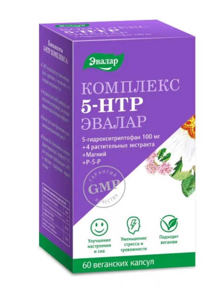 Натуральный продукт, содержащий биоактивный аминокислотный компонент 5-HTP, получаемый из семян растения грифонии. Формула капсул содержит 60 капсул по 0,4 грамма, представляющих собой источник поддержки для нервной системы. 5-HTP преобразуется в нашем организме в серотонин – важный нейромедиатор, который оказывает влияние на настроение, сон, аппетит и эмоциональное состояние. При приеме капсулы оказывают общее благоприятное воздействие на нервную систему, помогают улучшить настроение, снизить чувство тревоги и бессонницу. Рекомендуется принимать по 1-2 капсулы в день в зависимости от индивидуальных потребностей, консультация врача перед использованием обязательна. Рекомендуется в качестве биологически активной добавки к пище - дополнительного источника витамина В6 и магния, содержащей 5-гидрокситриптофан. Комплекс на основе натурального «антидепрессанта» 5-НТР, усиленного растительными компонентами и «элементами спокойствия» магнием и витамином В6. Способствует уменьшению влияния стресса на организм (беспокойство, депрессия, раздражительность, агрессивность, апатичное состояние, нервное напряжение, чувство тревоги), помогает успокоиться и расслабиться; способствует поддержке нервной системы; улучшению настроения; улучшению качества и продолжительности сна.