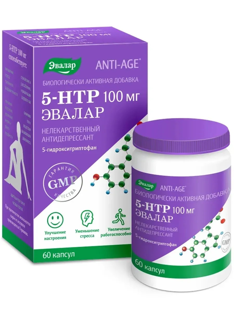 5-НТР от Эвалар – это натуральный нелекарственный «антидепрессант» растительного происхождения в капсулах с высокой степенью усвоения. В составе препарата содержится натуральный 5-гидрокситриптофан из экстракта гриффонии, который способствует:-синтезу в организме серотонина и мелатонина -уменьшению влияния стресса на организм (волнение, депрессия, раздражительность, агрессивность, апатичное состояние, панические приступы, невроз), помогает успокоиться и расслабиться -улучшению настроения -улучшению адаптации при смене часовых поясов doneувеличению энергии и работоспособности, ощущению бодрости -нормализации здорового цикла сна и бодрствования, нормализации сна на фоне эмоционального сбоя, улучшению качества и продолжительности сна-Кроме того, 5-НТР Эвалар способствует:-уменьшению пищевой зависимости, снижению тяги к углеводам: сладкому, мучному -снижению тяги к спиртному, табаку и другим веществам, вызывающим зависимость-