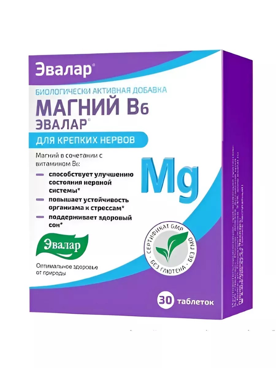 Магний В6 Эвалар - для крепких нервов.Магний B₆ Эвалар - комбинированный комплекс, состоящий из органической биодоступной соли магния (аспарагината магния) и витамина B₆.Магний в сочетании с витамином В6 способствуют улучшению состояния нервной системы, повышает устойчивость организма к стрессам, поддерживает здоровый сон.Содержание в 6 таблетках (суточном приеме):Магний, не менее 288 мгПиридоксин (витамин B₆), не менее 5,04 мгМагний является жизненно важным микроэлементом - он нужен практически каждой клетке нашего организма. Магний необходим для обеспечения энергетических процессов, отвечает за передачу и скорость прохождения нервного импульса от головного мозга к периферическим нервным окончаниям и мышцам, участвует в процессах ослабления нервно-мышечного напряжения, поддерживая нормальную нервно-мышечную возбудимость, в том числе сократительную способность миокарда. В стрессовых ситуациях организм теряет значительное количество ионов магния, в связи с чем его дополнительный прием защищает организм от последствий стресса. Магний поддерживает клеточный иммунитет, участвует в регуляции обмена веществ, способствует правильному распределению кальция в организме.Недостаток магния может наблюдаться при неправильном режиме питания, а потребность в нем увеличивается при физической и умственной активности, беременности, стрессах.Если возникает дефицит магния, организм вынужден использовать его из жизненно важных органов, что может негативно отразиться на их состоянии. Недостаток магния проявляется судорогами икроножных мышц, ощущением разбитости во всем теле, трудностями с засыпанием, нервозностью повышением кровяного давления, изменением сердечного ритма.Витамин B₆ улучшает усвоение магния и его метаболизм в клетке, обладает способностью фиксировать магний в клетке, что очень важно, поскольку макроэлемент быстро выводится из организма. Аспарагинат переносит ионы Mg⁺⁺ и способствует их проникновению во внутриклеточное пространство. Поступая в клетки, аспарагинат включается в процессы метаболизма.Разрешен беременным и кормящим женщинам.