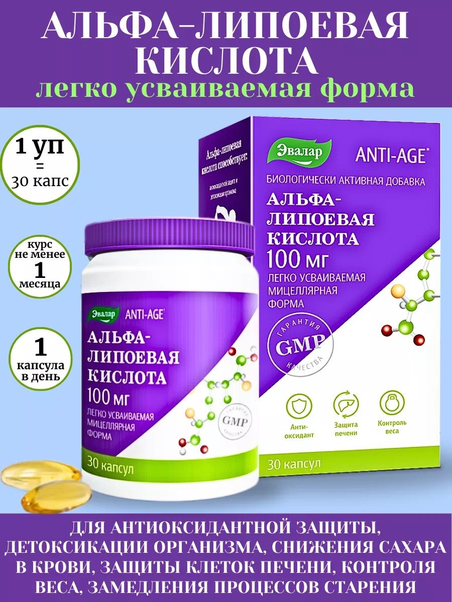 | Комплектация | альфа-липоевая кислота 100 мг n30 капс по 1,1г*1шт |