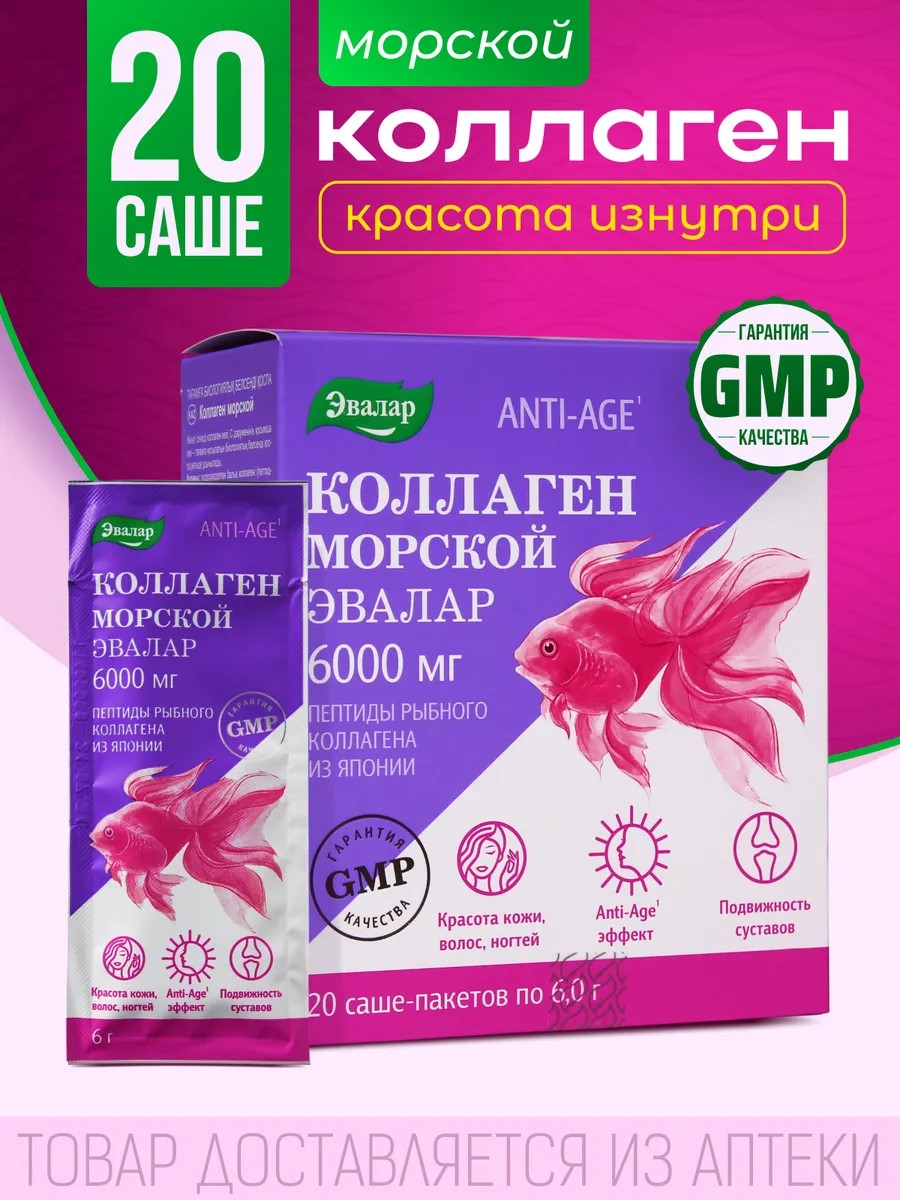 | Комплектация | Anti-age Коллаген морской Эвалар 6000 мг порошок саше 20 шт |