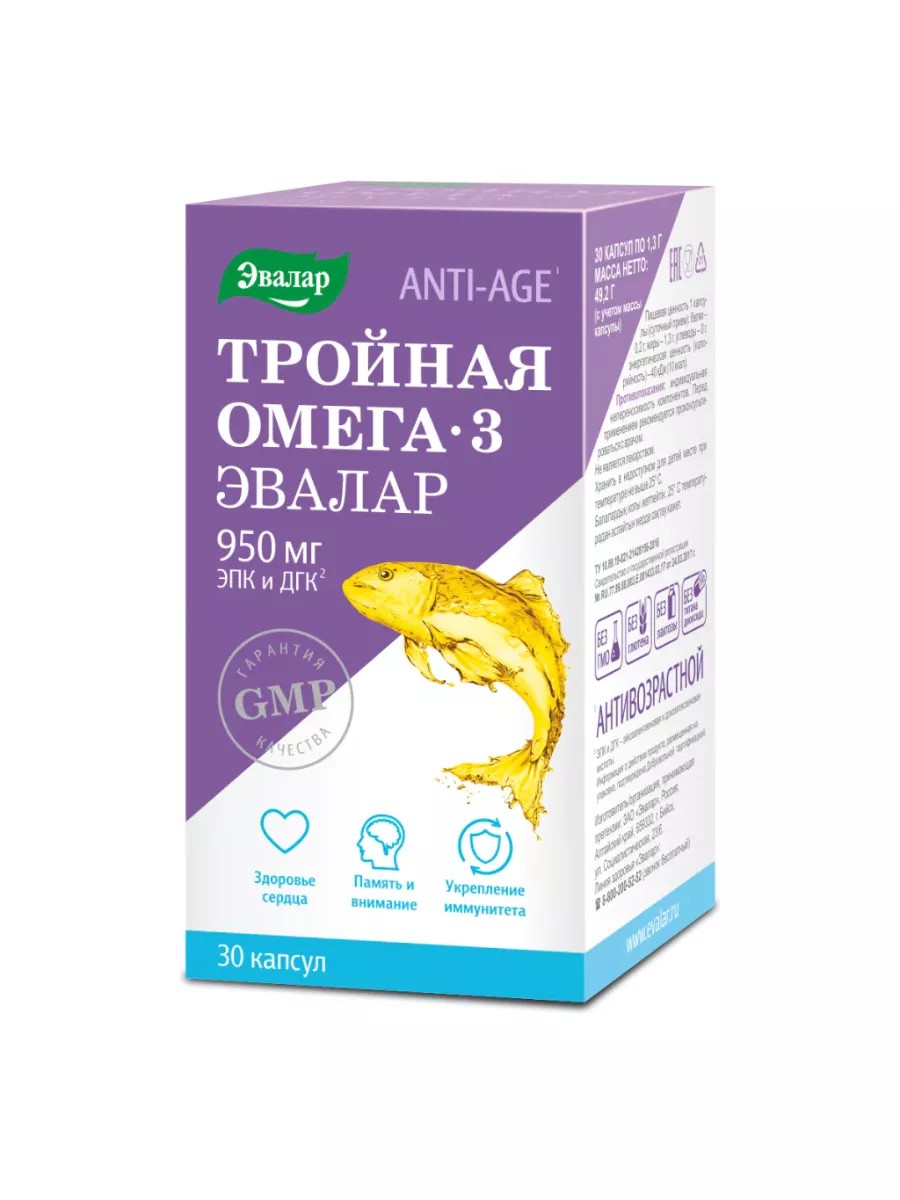 Тройная Омега-3 от компании Эвалар – это омега фармацевтического качества. Она содержит максимум омега-3 в каждой капсуле – 950 мг, и отличается высоким содержанием ЭПК и ДГК. Капсулы Тройной Омеги Эвалар в 3 раза сильнее обычных, и выгоднее зарубежного аналога. Для производства этих капсул используется сырье высочайшего качества от ведущих мировых производителей с исключительно высокой степенью очистки. Омега-3 получают из рыб холодных морей. Качество препарата гарантировано международным стандартом GMP. Регулярный прием Тройной Омега-3 Эвалар помогает укрепить сердечно-сосудистую систему, улучшить кровообращение, обеспечить нормальный уровень холестерина в крови, а также поддержать зрение, здоровье суставов, работу иммунной системы и мозга. Препарат разрешен беременным и кормящим женщинам. Взрослым рекомендуется принимать по 1 капсуле 1 раз в день во время еды. Продолжительность приема – 1 месяц. Перед применением рекомендуется проконсультироваться с врачом.