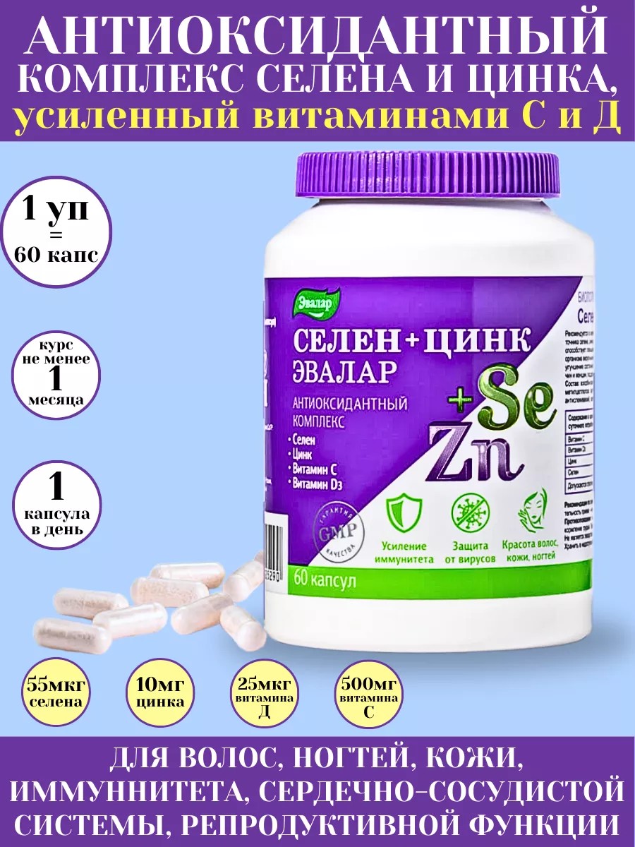 | Комплектация | селен+цинк эвалар n60 капс по 0,75г/банка*1шт |