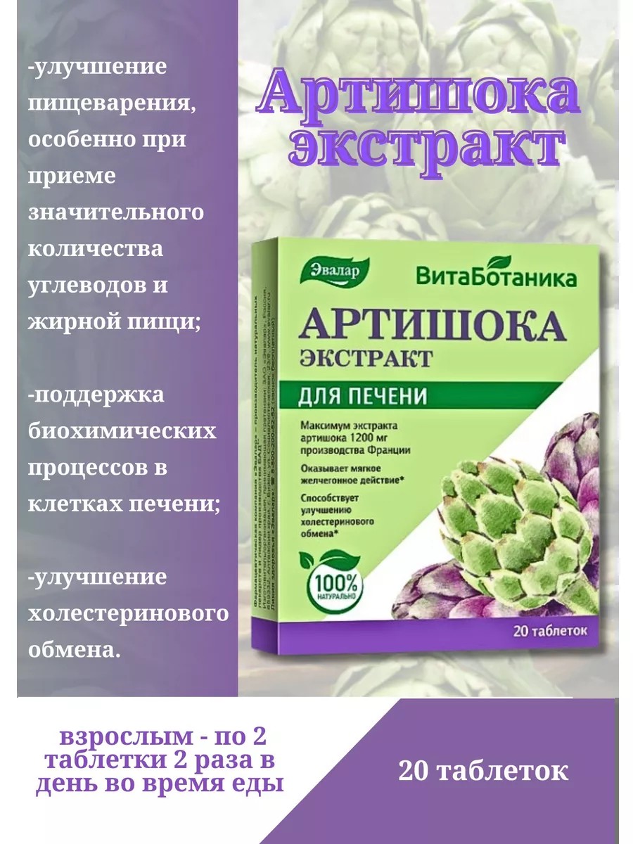 Артишок — экзотическое растение из Средиземноморья.В составе листьев артишока содержится цинарин, хлорогеновая и кофейная кислоты, минеральные соли, полисахариды (до 80% которых составляет инулин), пектин, дубильные вещества, органические кислоты, калий, а также витамины А, В1, В2, С.Артишок, благодаря своему составу, обладает мягким желчегонным действием, поддерживает естественную защиту клеток печени.Экстракт артишока способствует: улучшению секреции и оттоку желчи; улучшению функционального состояния печени.Содержащиеся в артишоке инулин, аскорбиновая кислота, каротин, витамины В1и В2 поддерживают основной обмен веществ и оказывают положительное влияние на метаболизм липидов.Артишок в таблетках способствует: улучшению пищеварения, особенно при приеме значительного количества углеводов и жирной пищи; поддержке биохимических процессов в клетках печени;улучшению холестеринового обмена. Взрослым – по 2 таблетки 2 раза в день во время еды. Продолжительность приёма – не менее 1 месяца с возможностью повтора через 10 дней.