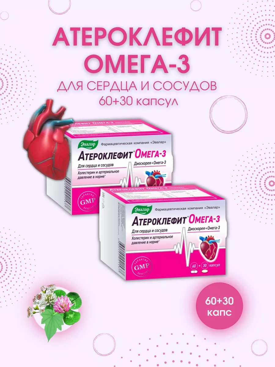 | Полное наименование товара | Атероклефит Био «Омега-3», капсулы с диоскореей и омега-3 для поддержки сердца и сосудов, 60 + 30 шт. |
