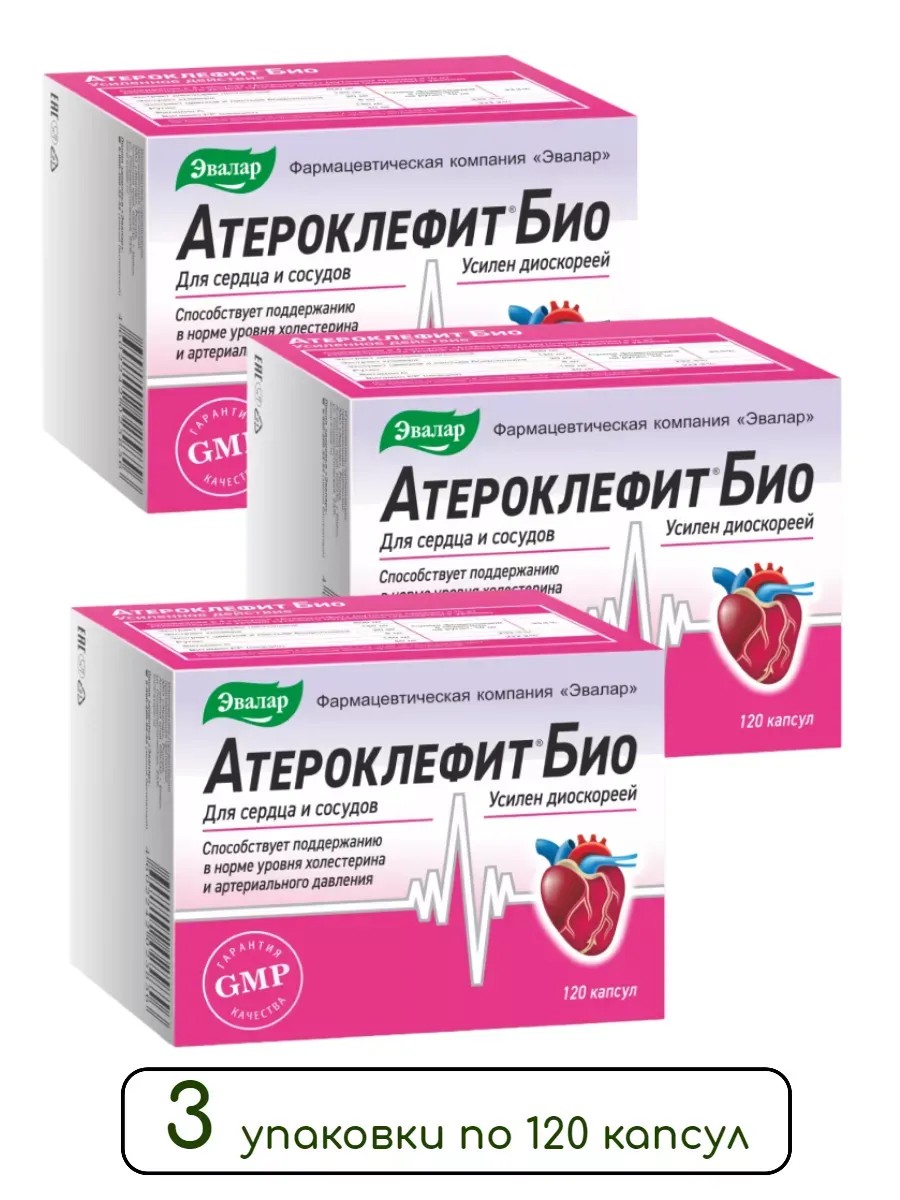 Атероклефит Био - растительное средство на основе диоскореи и красного клевера для поддержания здоровья сердца и сосудов. Комплекс растительных экстрактов и витаминов способствует поддержанию в норме уровня холестерина и артериального давления, нормализации липидного обмена (перевод ЛПНП («плохого холестерина») в ЛПВП («хороший холестерин»)), снижению риска развития атеросклеротических изменений сосудов, улучшению функционального состояния сердечно-сосудистой системы. В упаковке находятся 120 капсул. Рекомендуется принимать по 1-2 капсуле 2 раза в день во время еды.Прием Атероклефит БИО может способствовать снижению:-уровня «плохого» холестерина - низкой плотности, сохраняя «хороший» холестерин - высокой плотности, необходимый для правильного функционирования головного мозга и производства гормонов тестостерона и эстрогена-артериального давления до нормы и снижению риска развития атеросклеротических изменений сосудов.Кроме того, препарат Атероклефит БИО также способствует:-улучшению функционального состояния сердечно-сосудистой системы-снижению риска развития атеросклеротических изменений сосудов.