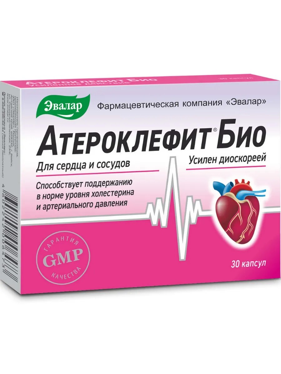 Натуральное средство Атероклефит БИО от компании Эвалар способствует: - снижению "плохого" и сохранению "хорошего" холестерина; - снижению риска развития атеросклеротических изменений сосудов; - снижению артериального давления; - улучшению состояния сердечно-сосудистой системы.