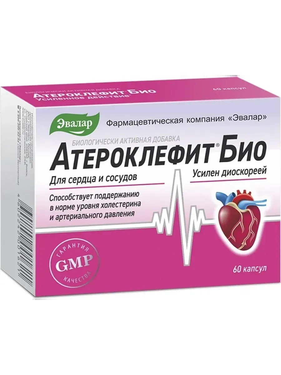 Растительное средство на основе диоскореи и красного клевера для поддержания уровня холестерина в норме. Диоскорея может:-снижать уровень холестерина низкой плотности, увеличивая его выведение из кишечника вместе с желчью и уменьшая всасывание--препятствовать отложению «плохого» холестерина на стенках сосудов и образованию бляшек-способствовать расширению сосудов и нормализации артериального давления-предотвращать увеличение размера и кальцификацию атеросклеротической бляшки, за счет этого снижается риск ее разрыва и развития острых сосудистых осложнений атеросклероза-восстанавливать образование оксида азота и нормализовать состояние эндотелия сосудов-уменьшать воспалительный процесс в сосудистой стенке-улучшать сократительную функцию сердца-К препаратам, содержащим в своем составе диоскорею относится Атероклефит БИО от компании «Эвалар». Прием 2 капсул Атероклефит БИО утром и 2 капсул вечером может способствовать снижению:-уровня «плохого» холестерина – низкой плотности, сохраняя «хороший» холестерин – высокой плотности, необходимый для правильного функционирования головного мозга и производства гормонов тестостерона и эстрогена-артериального давления до нормы и снижению риска развития атеросклеротических изменений сосудов.-Кроме того препарат Атероклефит БИО также способствует:-улучшению функционального состояния сердечно-сосудистой системы--снижению риска развития атеросклеротических изменений сосудов-Также в состав Атероклефит БИО входят:-экстракт клевера, который способствует разрушению жировых отложений на стенках сосудов и переводу холестерина из «плохого»» в «хороший».--экстракт листьев и цветков боярышника — содержит повышенное количество аскорбиновой кислоты (витамина С), обладает мощным антиоксидантным действием;-рутин — уменьшает ломкость капилляров, укрепляет их стенки;-никотиновая кислота (ниацин) — регулирует концентрацию холестерина, блокирует липолиз (т. е. не дает жироподобным веществам переходить в кровеносное русло).-
