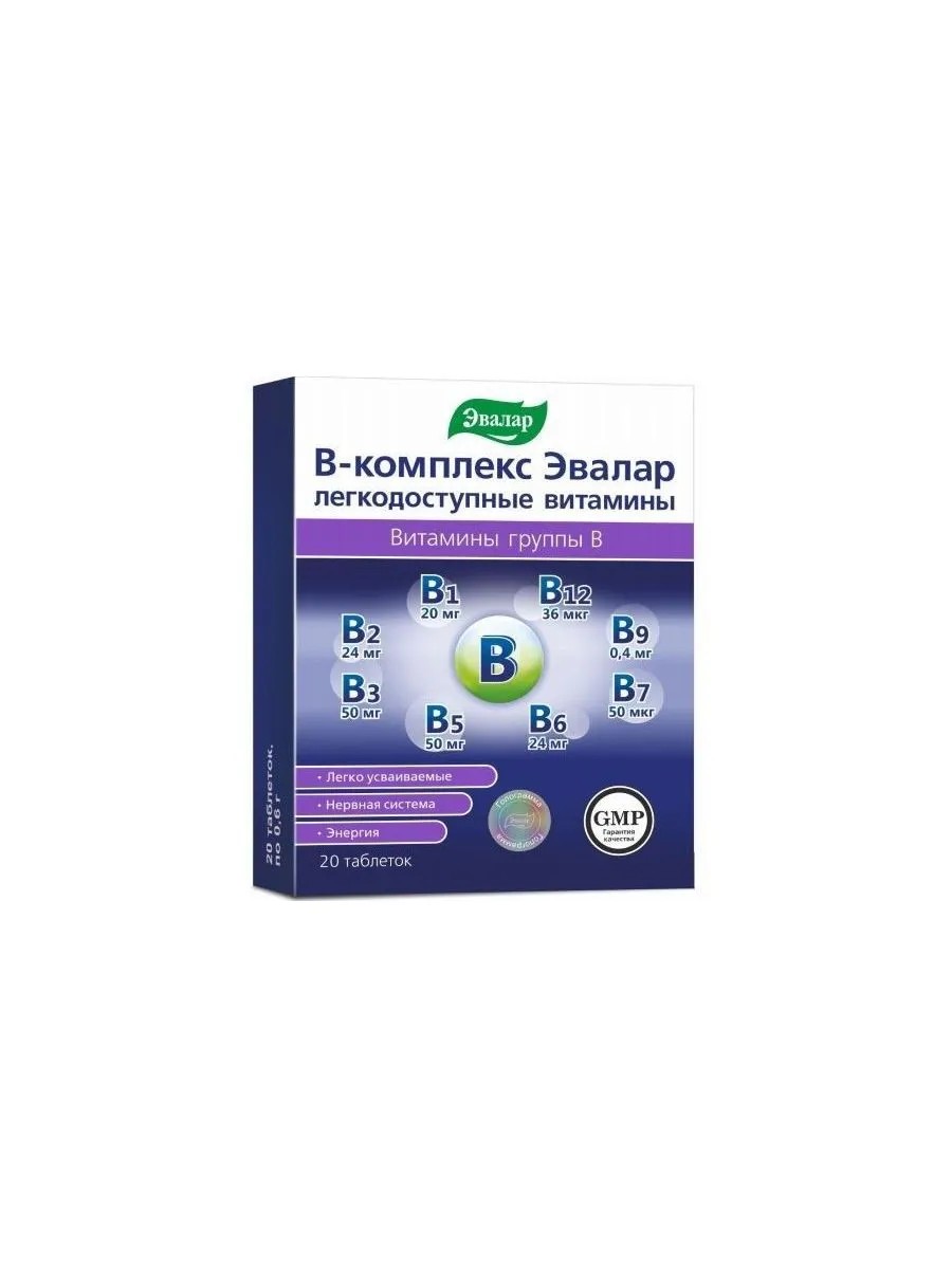Evalar B-Complex, readily available vitamins, 20 tablets, 0.6 g each. An additional source of B vitamins. As a dietary supplement. B vitamins. A biologically active food supplement - an additional source of B vitamins (B1, B2, B3, B5, B6, B7, B9, B12).