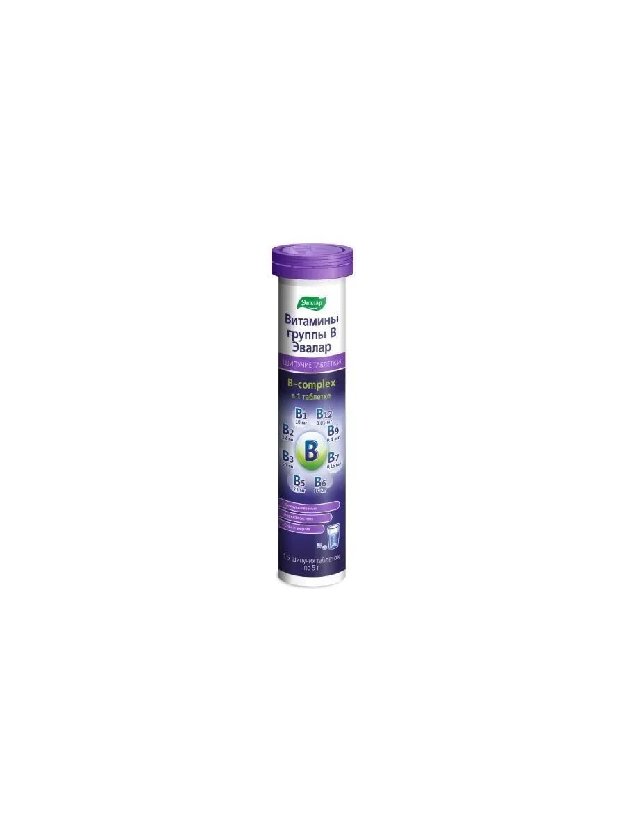 Evalar B vitamins n15 tablets spiked 5.0 g. An additional source of B vitamins, vitamin C, and zinc. As a dietary supplement. Citric acid, sodium bicarbonate. Maltodextrin. Ascorbic acid, natural orange flavor, magnesium carbonate, calcium pantothenate, natural beetroot color, sucralose. An additional source of B vitamins (B1, B2, B3, B5, B6, B7 (biotin), B9, B12), vitamin C, zinc.