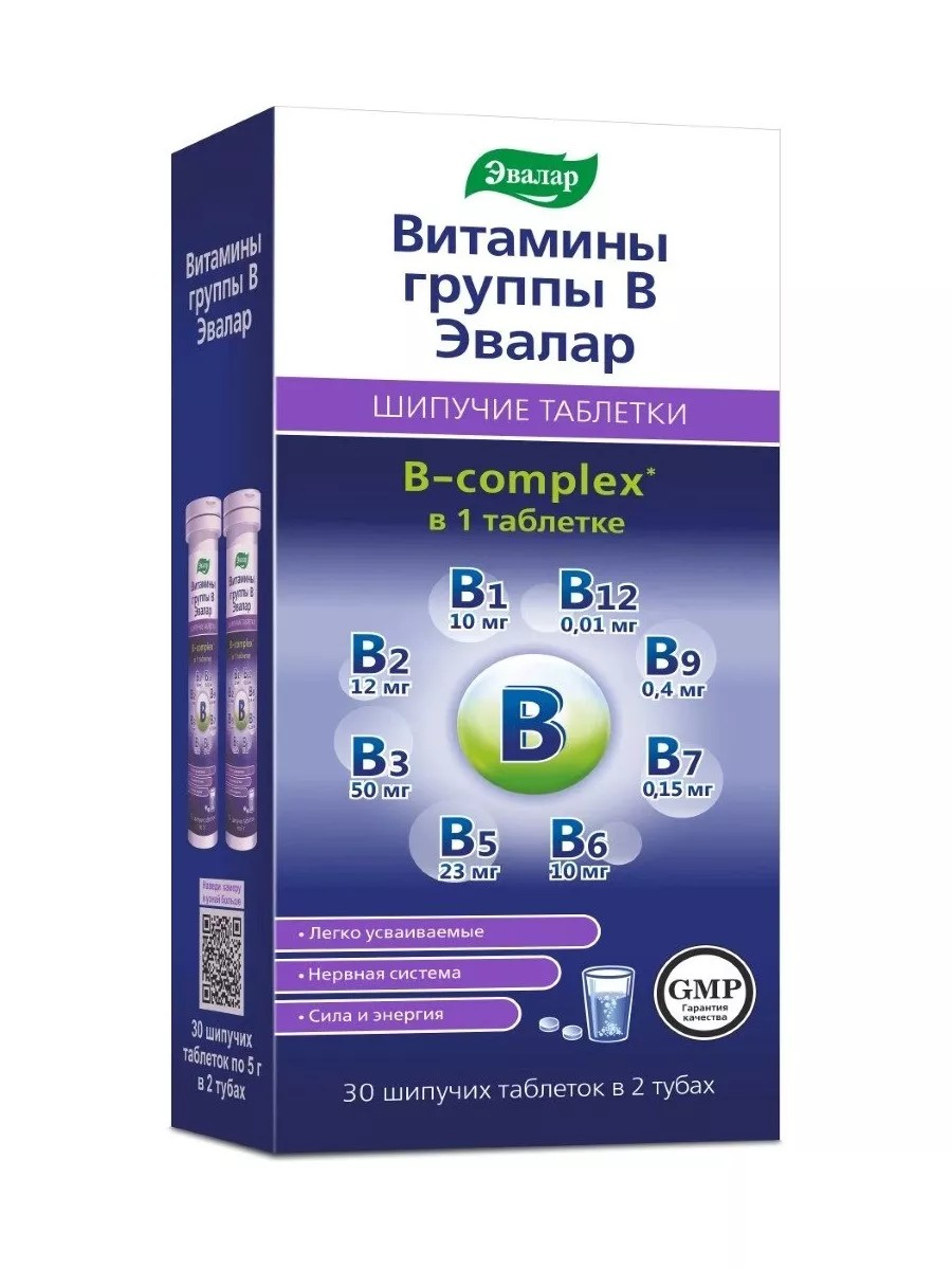 Эвалар Витамины группы B - это биологически активная добавка (БАД) к пище - удобная форма приема витаминов группы B в виде шипучих таблеток, которые растворяются в воде. В одной упаковке содержится 30 таблеток, каждая из которых имеет массу 5 грамм.